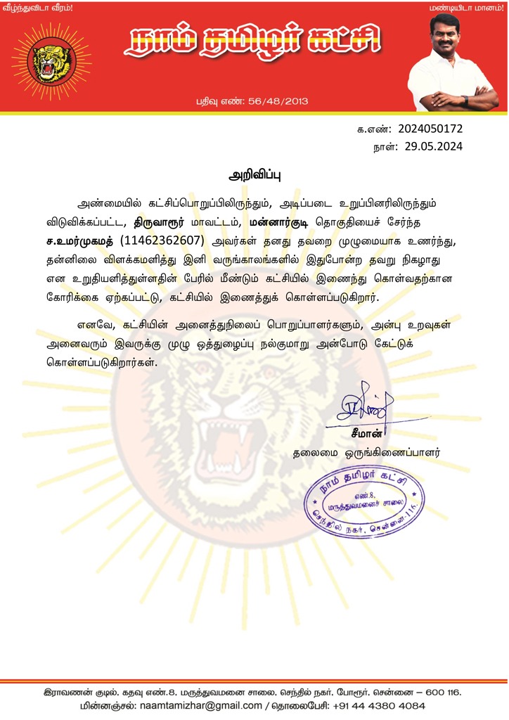 அண்மையில் கட்சிப்பொறுப்பிலிருந்தும், அடிப்படை உறுப்பினரிலிருந்தும் விடுவிக்கப்பட்ட, திருவாரூர் மாவட்டம், மன்னார்குடி தொகுதியைச் சேர்ந்த ச.உமர்முகமத் (11462362607) அவர்கள் தனது தவறை முழுமையாக உணர்ந்து, தன்னிலை விளக்கமளித்து இனி வருங்காலங்களில் இதுபோன்ற தவறு நிகழாது என உறுதியளித்துள்ளதின் பேரில் மீண்டும் கட்சியில் இணைந்து கொள்வதற்கான கோரிக்கை ஏற்கப்பட்டு, கட்சியில் இணைத்துக் கொள்ளப்படுகிறார்.