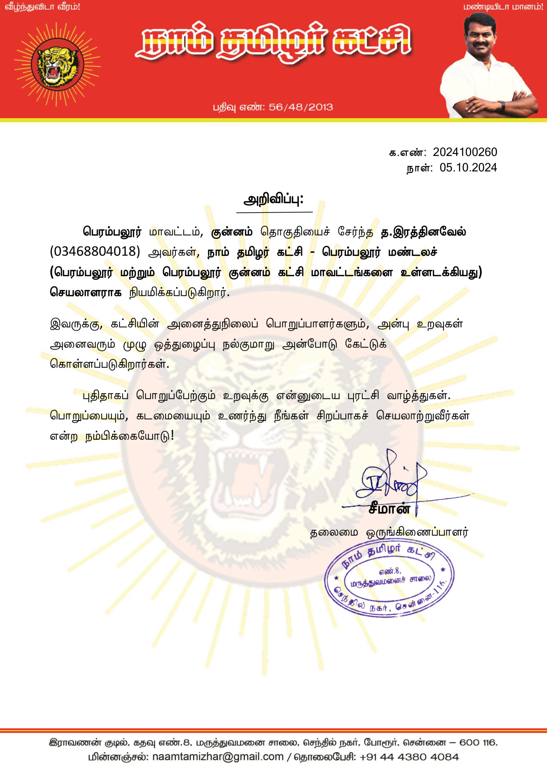பெரம்பலூர் மாவட்டம், குன்னம் தொகுதியைச் சேர்ந்த த.இரத்தினவேல் (03468804018) அவர்கள், நாம் தமிழர் கட்சி – பெரம்பலூர் மண்டலச் (பெரம்பலூர் மற்றும் பெரம்பலூர் குன்னம் கட்சி மாவட்டங்களை உள்ளடக்கியது) செயலாளராக நியமிக்கப்படுகிறார்.