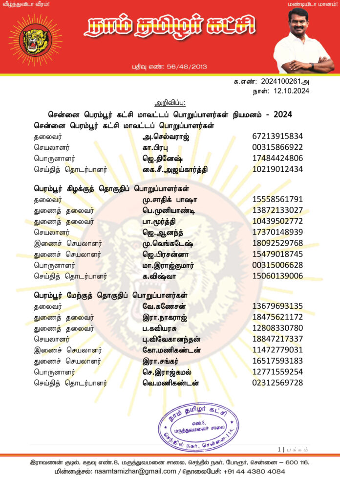 மேற்காண் அனைவரும் நாம் தமிழர் கட்சி – சென்னை பெரம்பூர் கட்சி மாவட்டப் பொறுப்பாளர்களாக நியமிக்கப்படுகிறார்கள். இவர்கள் அனைவருக்கும், கட்சியின் அனைத்துநிலைப் பொறுப்பாளர்களும், அன்பு உறவுகள் அனைவரும் முழு ஒத்துழைப்பு நல்குமாறு அன்போடு கேட்டுக் கொள்ளப்படுகிறார்கள்.