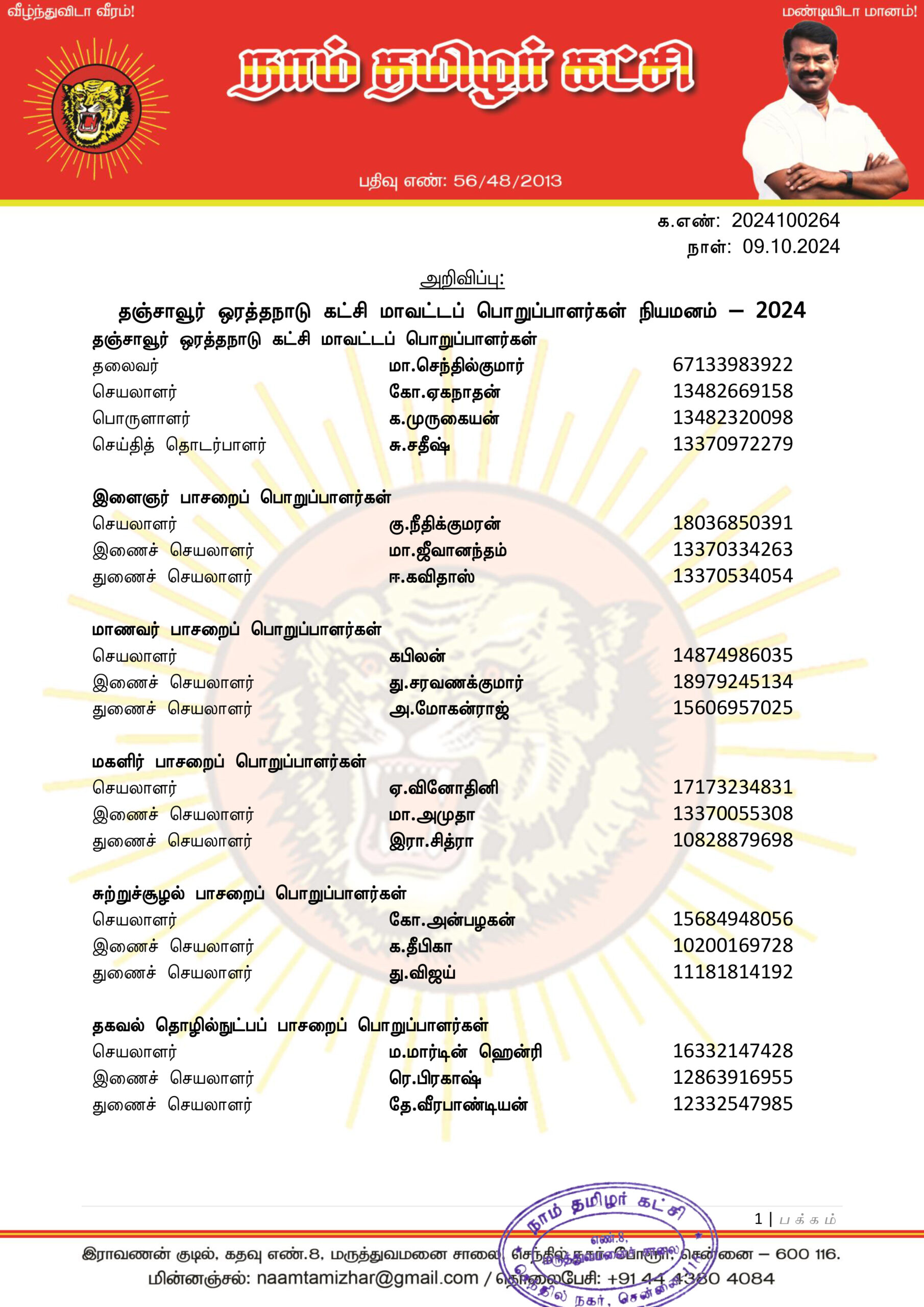 மேற்காண் அனைவரும் நாம் தமிழர் கட்சி – தஞ்சாவூர் ஒரத்தநாடு கட்சி மாவட்டப் பொறுப்பாளர்களாக நியமிக்கப்படுகிறார்கள். இவர்கள் அனைவருக்கும், கட்சியின் அனைத்துநிலைப் பொறுப்பாளர்களும், அன்பு உறவுகள் அனைவரும் முழு ஒத்துழைப்பு நல்குமாறு அன்போடு கேட்டுக் கொள்ளப்படுகிறார்கள்.