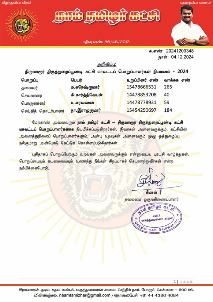 மேற்காண் அனைவரும் நாம் தமிழர் கட்சி – திருவாரூர் திருத்துறைப்பூண்டி கட்சி மாவட்டப் பொறுப்பாளர்களாக நியமிக்கப்படுகிறார்கள். இவர்கள் அனைவருக்கும், கட்சியின் அனைத்துநிலைப் பொறுப்பாளர்களும், அன்பு உறவுகள் அனைவரும் முழு ஒத்துழைப்பு நல்குமாறு அன்போடு கேட்டுக் கொள்ளப்படுகிறார்கள்.