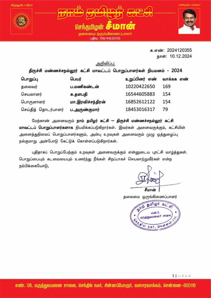 மேற்காண் அனைவரும் நாம் தமிழர் கட்சி – திருச்சி மண்ணச்சநல்லூர் கட்சி மாவட்டப் பொறுப்பாளர்களாக நியமிக்கப்படுகிறார்கள். இவர்கள் அனைவருக்கும், கட்சியின் அனைத்துநிலைப் பொறுப்பாளர்களும், அன்பு உறவுகள் அனைவரும் முழு ஒத்துழைப்பு நல்குமாறு அன்போடு கேட்டுக் கொள்ளப்படுகிறார்கள்.