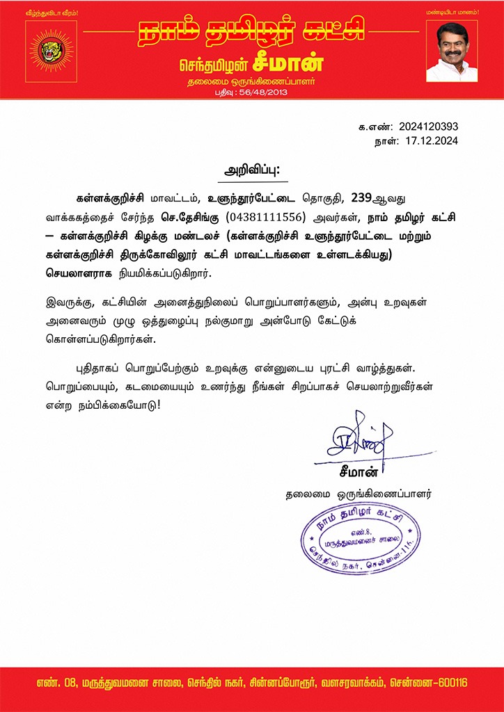 கள்ளக்குறிச்சி மாவட்டம், உளுந்தூர்பேட்டை தொகுதி, 239ஆவது வாக்ககத்தைச் சேர்ந்த செ.தேசிங்கு (04381111556) அவர்கள், நாம் தமிழர் கட்சி – கள்ளக்குறிச்சி கிழக்கு மண்டலச் (கள்ளக்குறிச்சி உளுந்தூர்பேட்டை மற்றும் கள்ளக்குறிச்சி திருக்கோவிலூர் கட்சி மாவட்டங்களை உள்ளடக்கியது) செயலாளராக நியமிக்கப்படுகிறார்.