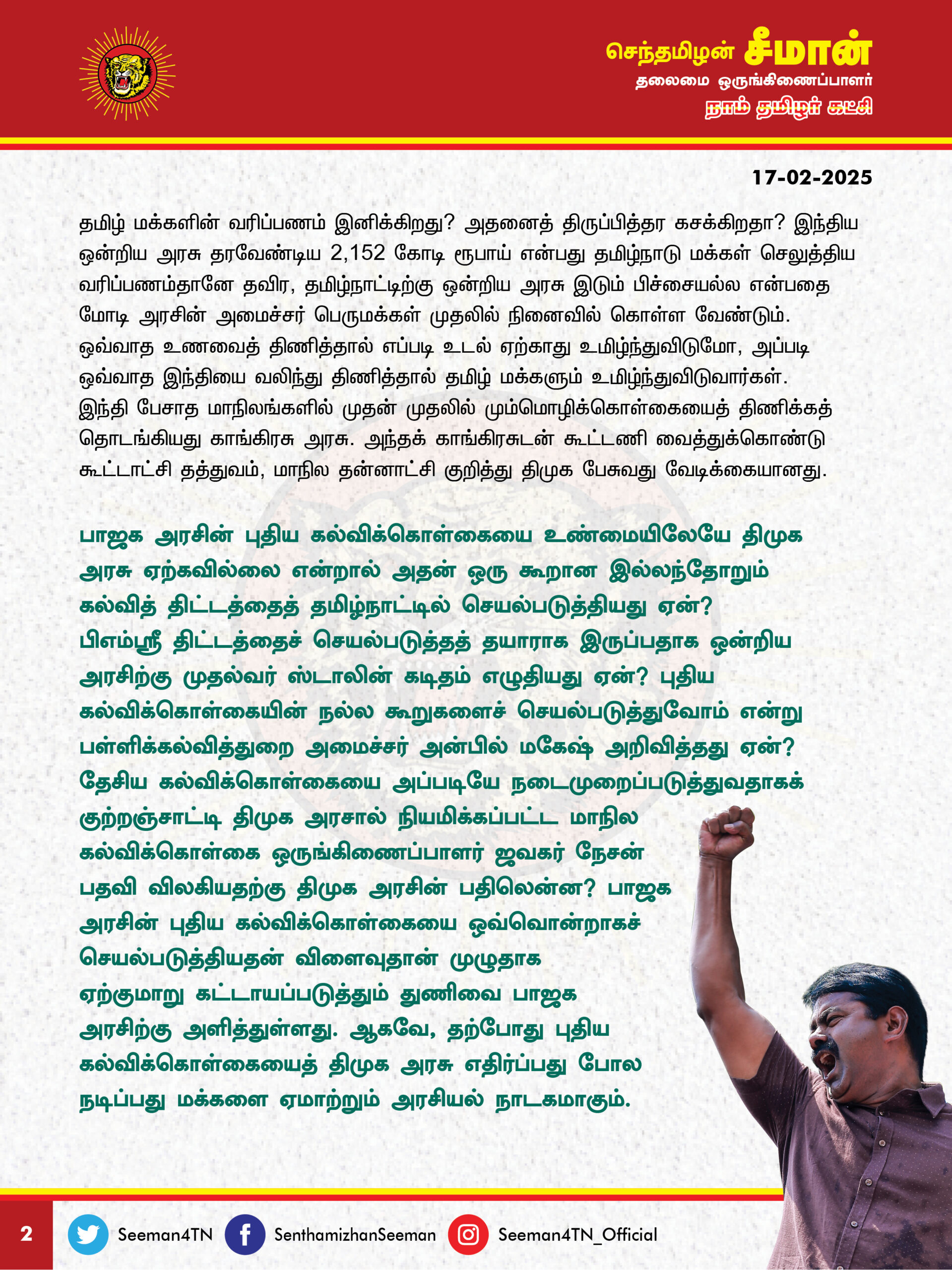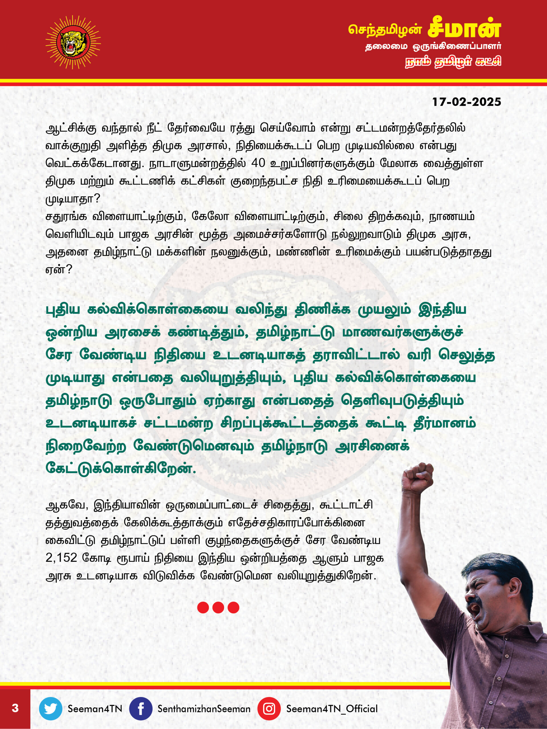 புதிய கல்விக்கொள்கையை வலிந்து திணிக்க முயலும் இந்திய ஒன்றிய அரசைக் கண்டித்தும், தமிழ்நாட்டு மாணவர்களுக்குச் சேர வேண்டிய நிதியை உடனடியாகத் தராவிட்டால் வரி செலுத்த முடியாது என்பதை வலியுறுத்தியும், புதிய கல்விக்கொள்கையை தமிழ்நாடு ஒருபோதும் ஏற்காது என்பதைத் தெளிவுபடுத்தியும் உடனடியாகச் சட்டமன்ற சிறப்புக்கூட்டத்தைக் கூட்டி தீர்மானம் நிறைவேற்ற வேண்டுமெனவும் தமிழ்நாடு அரசினைக் கேட்டுக்கொள்கிறேன்.