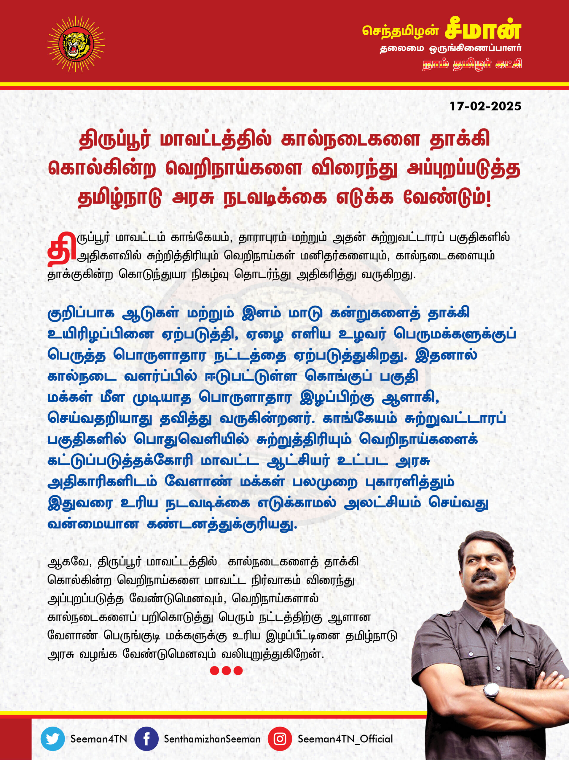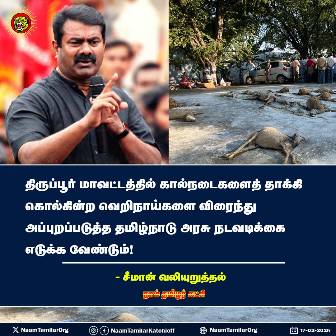 திருப்பூர் மாவட்டத்தில் கால்நடைகளைத் தாக்கி கொல்கின்ற வெறிநாய்களை விரைந்து அப்புறப்படுத்த தமிழ்நாடு அரசு நடவடிக்கை எடுக்க வேண்டும்! – சீமான் வலியுறுத்தல்