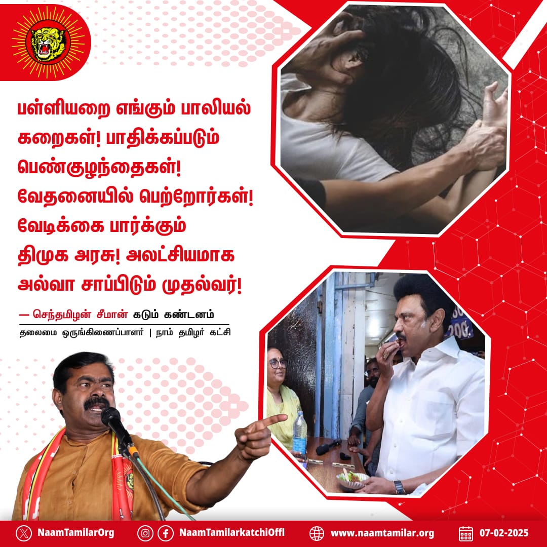 பள்ளியறை எங்கும் பாலியல் கறைகள்! பாதிக்கப்படும் பெண்குழந்தைகள்! வேதனையில் பெற்றோர்கள்! வேடிக்கை பார்க்கும் திமுக அரசு! அலட்சியமாக அல்வா சாப்பிடும் முதல்வர்! – சீமான் கடும் கண்டனம்