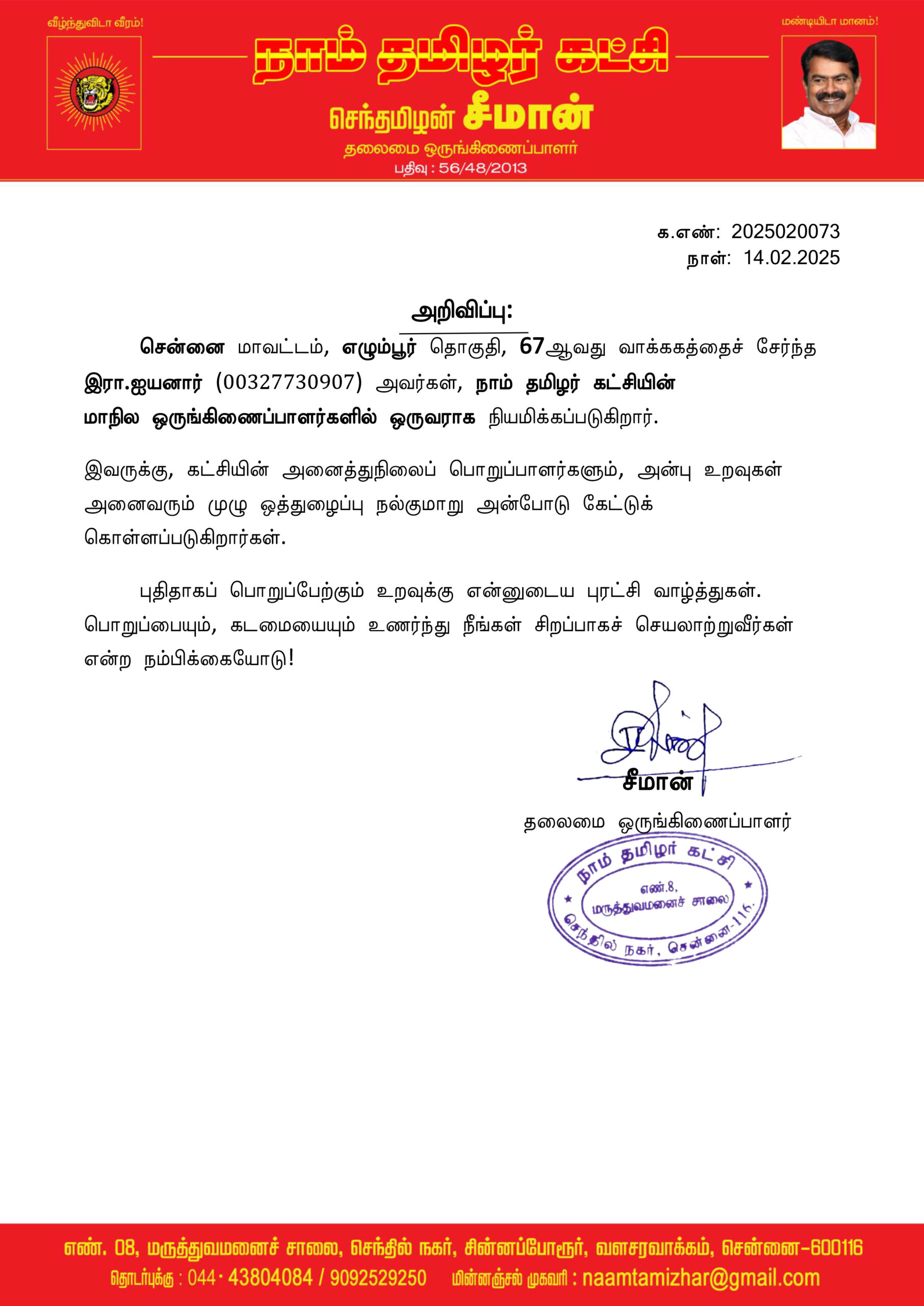 சென்னை மாவட்டம், எழும்பூர் தொகுதி, 67ஆவது வாக்ககத்தைச் சேர்ந்த இரா.ஐயனார் (00327730907) அவர்கள், நாம் தமிழர் கட்சியின்