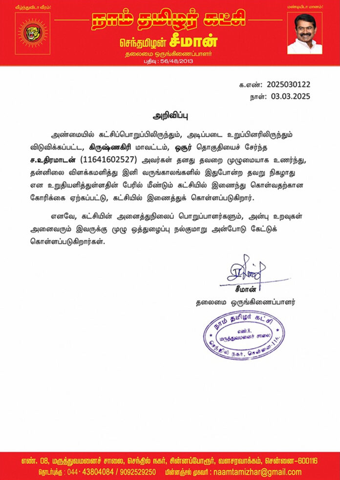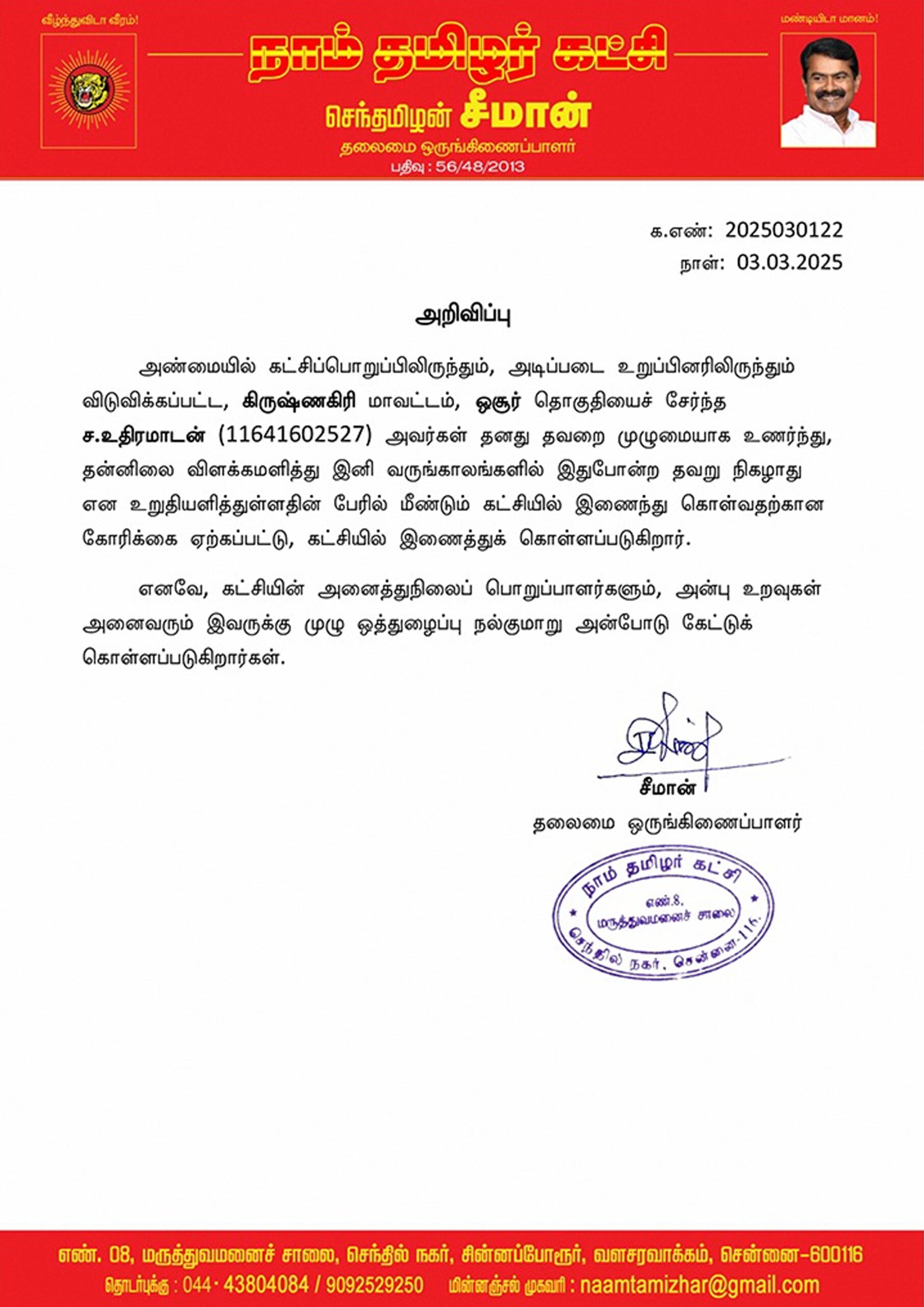 அண்மையில் கட்சிப்பொறுப்பிலிருந்தும், அடிப்படை உறுப்பினரிலிருந்தும் விடுவிக்கப்பட்ட, கிருஷ்ணகிரி மாவட்டம், ஒசூர் தொகுதியைச் சேர்ந்த ச.உதிரமாடன் (11641602527) அவர்கள் தனது தவறை முழுமையாக உணர்ந்து, தன்னிலை விளக்கமளித்து இனி வருங்காலங்களில் இதுபோன்ற தவறு நிகழாது என உறுதியளித்துள்ளதின் பேரில் மீண்டும் கட்சியில் இணைந்து கொள்வதற்கான கோரிக்கை ஏற்கப்பட்டு, கட்சியில் இணைத்துக் கொள்ளப்படுகிறார்.