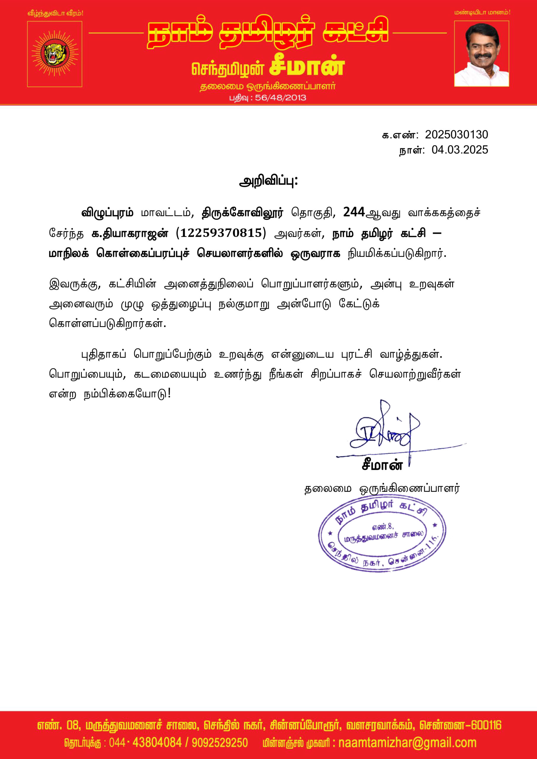 விழுப்புரம் மாவட்டம், திருக்கோவிலூர் தொகுதி, 244ஆவது வாக்ககத்தைச் சேர்ந்த க.தியாகராஜன் (12259370815) அவர்கள், நாம் தமிழர் கட்சி – மாநிலக் கொள்கைப்பரப்புச் செயலாளர்களில் ஒருவராக நியமிக்கப்படுகிறார்.
