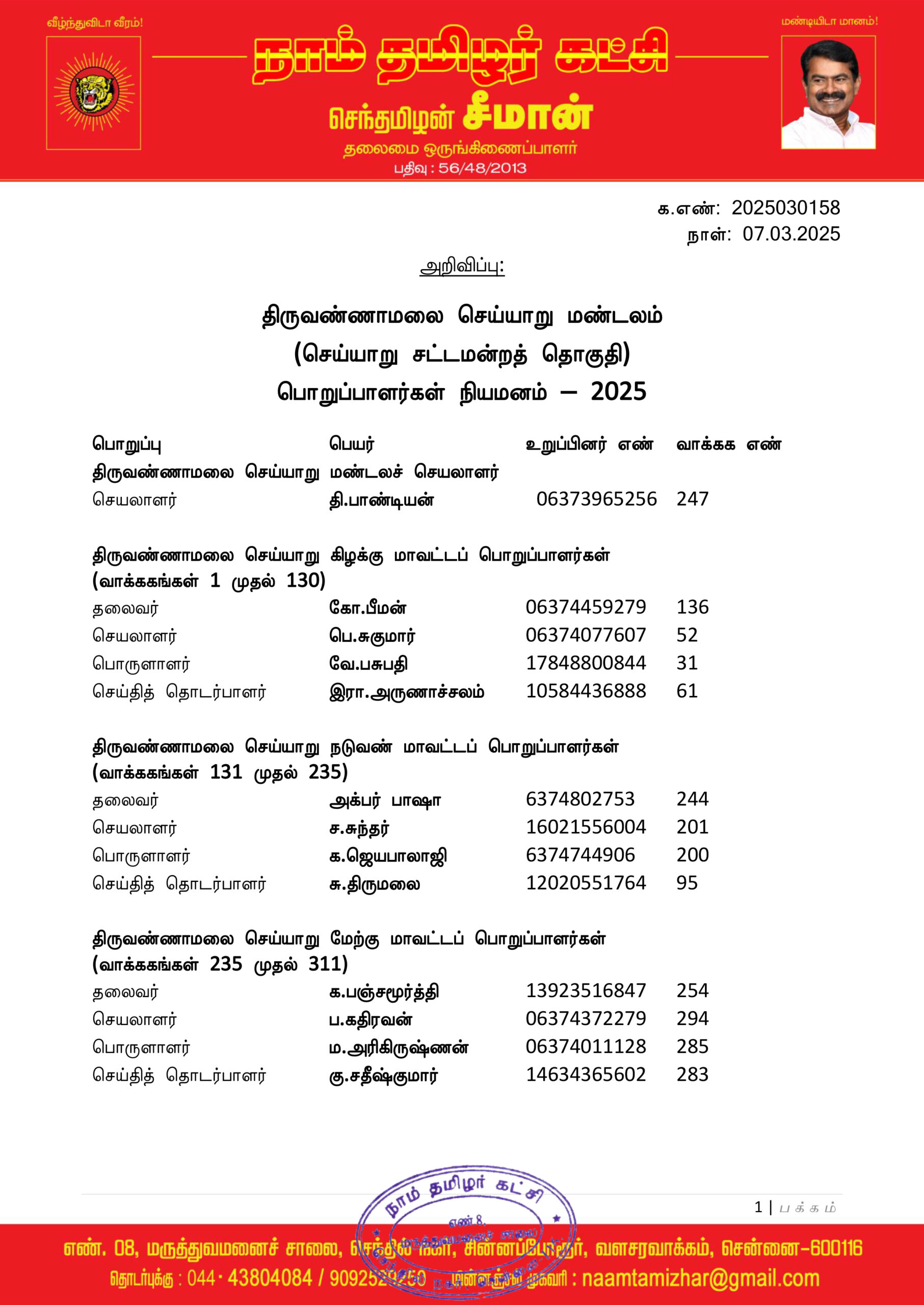 மேற்காண் அனைவரும் நாம் தமிழர் கட்சி – திருவண்ணாமலை செய்யாறு மண்டலத்திற்குட்பட்ட பொறுப்பாளர்களாக நியமிக்கப்படுகிறார்கள்.இவர்கள் அனைவருக்கும், கட்சியின் அனைத்துநிலைப் பொறுப்பாளர்களும், அன்பு உறவுகள் அனைவரும் முழு ஒத்துழைப்பு நல்குமாறு அன்போடு கேட்டுக் கொள்ளப்படுகிறார்கள்.