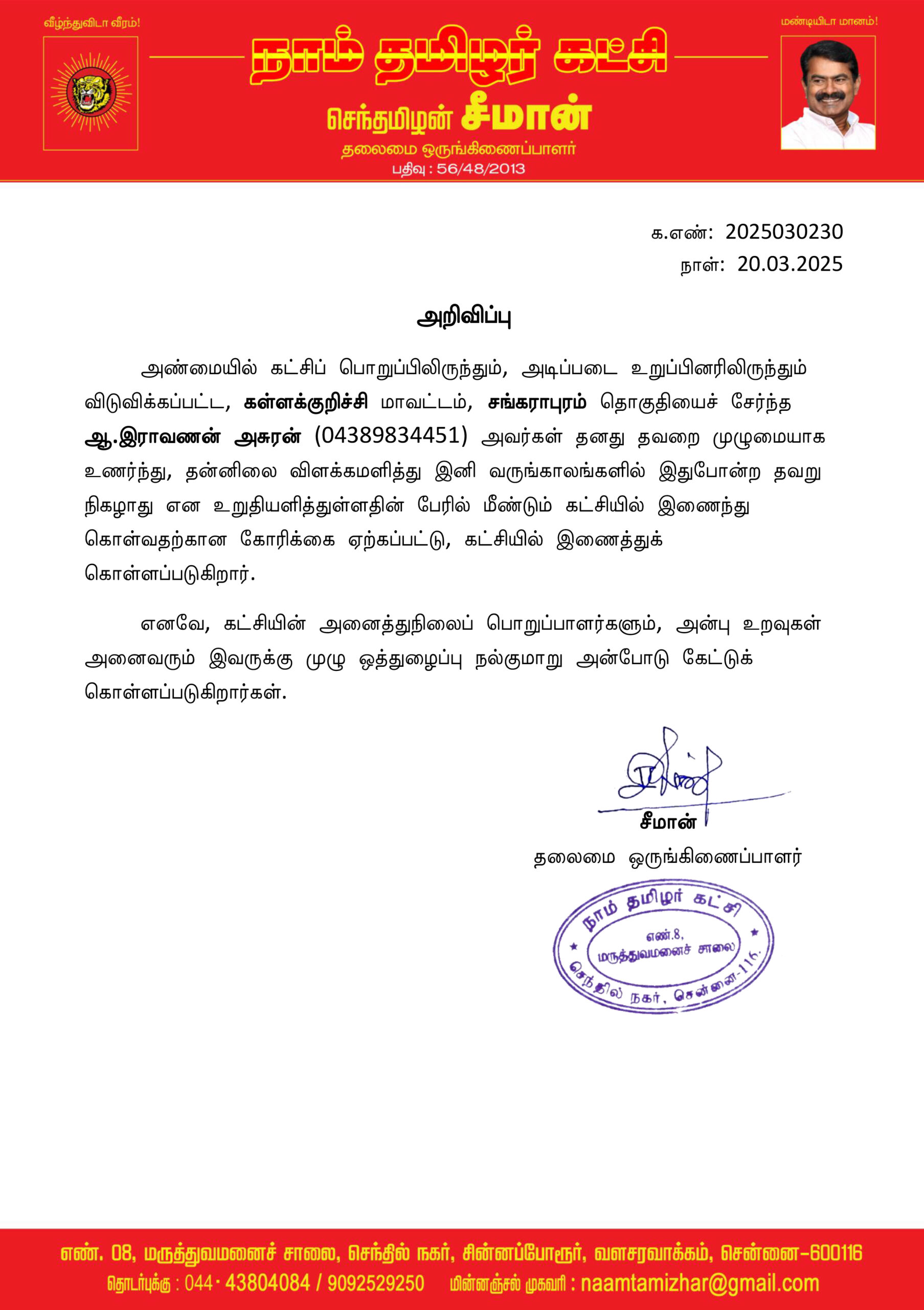 அண்மையில் கட்சிப் பொறுப்பிலிருந்தும், அடிப்படை உறுப்பினரிலிருந்தும் விடுவிக்கப்பட்ட, கள்ளக்குறிச்சி மாவட்டம், சங்கராபுரம் தொகுதியைச் சேர்ந்த ஆ.இராவணன் அசுரன் (04389834451) அவர்கள் தனது தவறை முழுமையாக உணர்ந்து, தன்னிலை விளக்கமளித்து இனி வருங்காலங்களில் இதுபோன்ற தவறு நிகழாது என உறுதியளித்துள்ளதின் பேரில் மீண்டும் கட்சியில் இணைந்து கொள்வதற்கான கோரிக்கை ஏற்கப்பட்டு, கட்சியில் இணைத்துக் கொள்ளப்படுகிறார்.