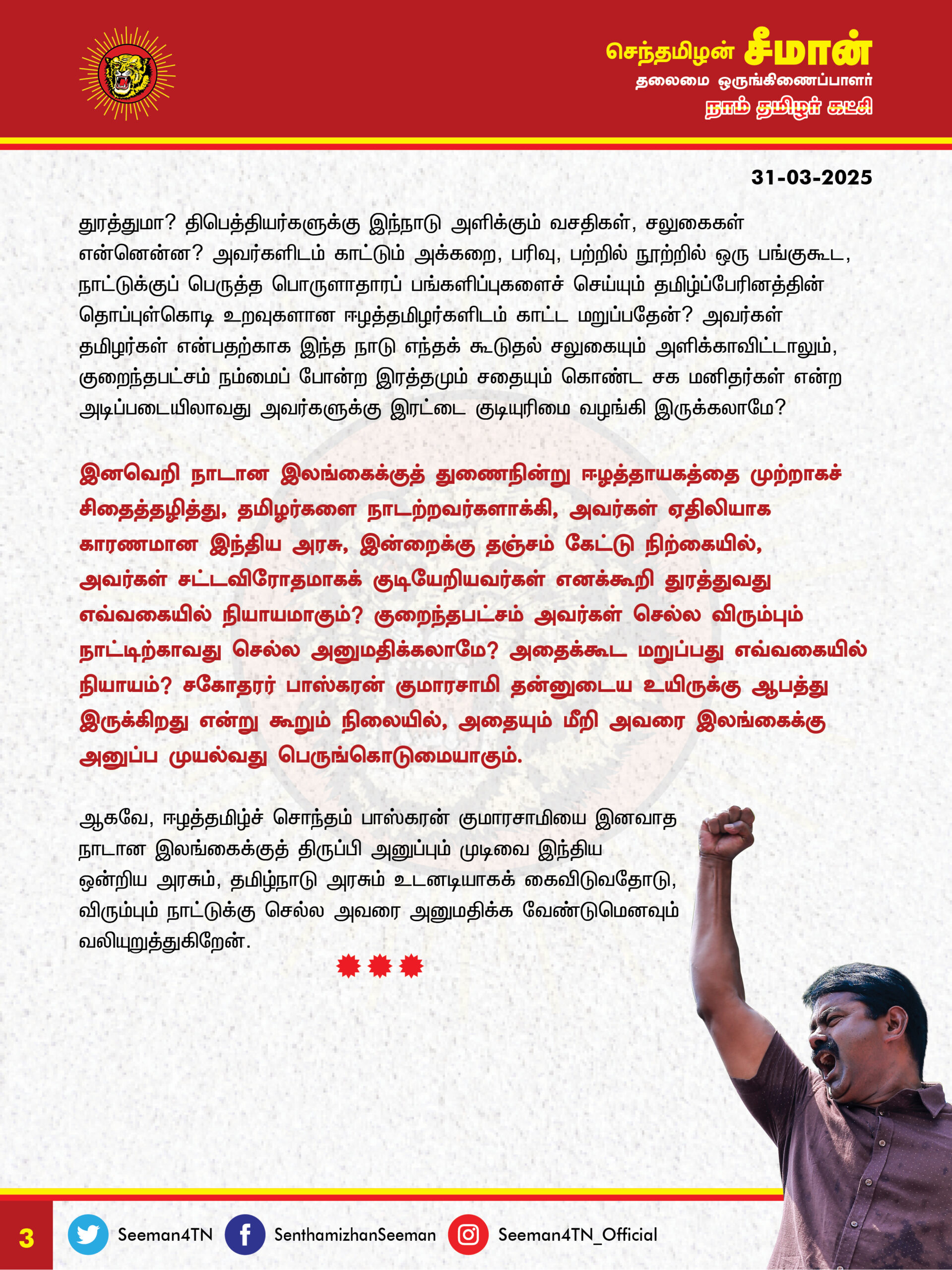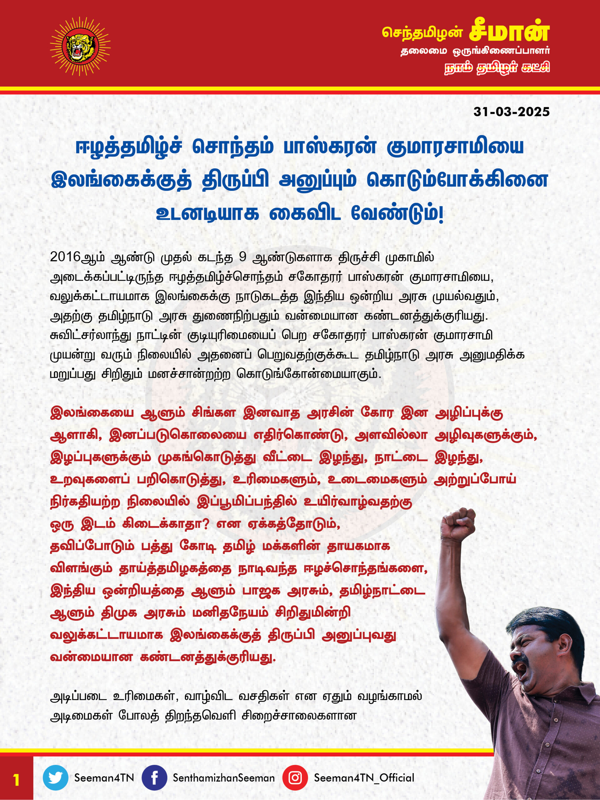2016ஆம் ஆண்டு முதல் கடந்த 9 ஆண்டுகளாக திருச்சி முகாமில் அடைக்கப்பட்டிருந்த ஈழத்தமிழ்ச்சொந்தம் சகோதரர் பாஸ்கரன் குமாரசாமியை, வலுக்கட்டாயமாக இலங்கைக்கு நாடுகடத்த இந்திய ஒன்றிய அரசு முயல்வதும், அதற்கு தமிழ்நாடு அரசு துணைநிற்பதும் வன்மையான கண்டனத்துக்குரியது.