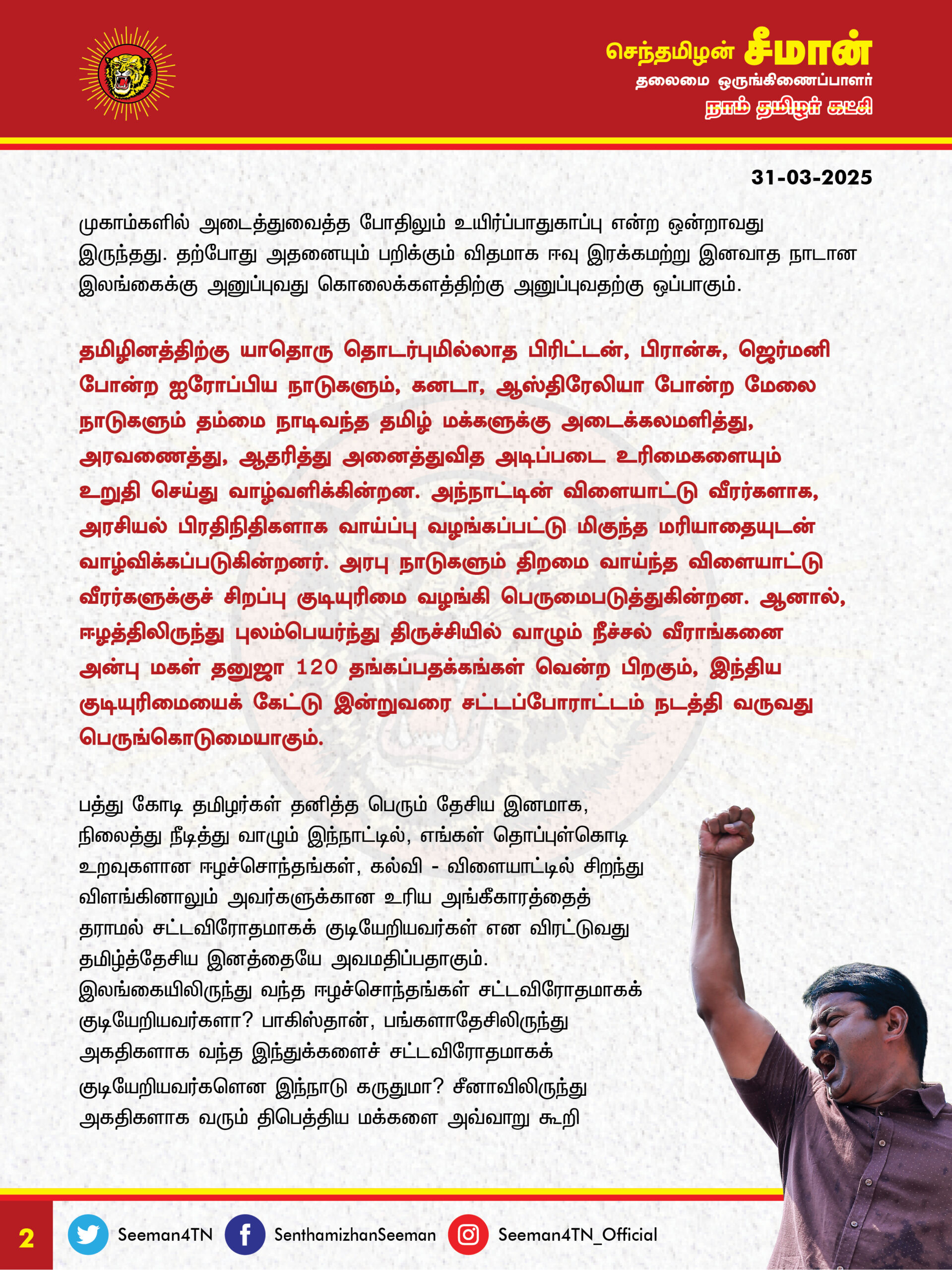 பத்து கோடி தமிழர்கள் தனித்த பெரும் தேசிய இனமாக, நிலைத்து நீடித்து வாழும் இந்நாட்டில், எங்கள் தொப்புள்கொடி உறவுகளான ஈழச்சொந்தங்கள், கல்வி – விளையாட்டில் சிறந்து விளங்கினாலும் அவர்களுக்கான உரிய அங்கீகாரத்தைத் தராமல் சட்டவிரோதமாகக் குடியேறியவர்கள் என விரட்டுவது தமிழ்த்தேசிய இனத்தையே அவமதிப்பதாகும். இலங்கையிலிருந்து வந்த ஈழச்சொந்தங்கள் சட்டவிரோதமாகக் குடியேறியவர்களா? பாகிஸ்தான், பங்களாதேசிலிருந்து அகதிகளாக வந்த இந்துக்களைச் சட்டவிரோதமாகக் குடியேறியவர்களென இந்நாடு கருதுமா? சீனாவிலிருந்து அகதிகளாக வரும் திபெத்திய மக்களை அவ்வாறு கூறி துரத்துமா? திபெத்தியர்களுக்கு இந்நாடு அளிக்கும் வசதிகள், சலுகைகள் என்னென்ன? அவர்களிடம் காட்டும் அக்கறை, பரிவு, பற்றில் நூற்றில் ஒரு பங்குகூட, நாட்டுக்குப் பெருத்த பொருளாதாரப் பங்களிப்புகளைச் செய்யும் தமிழ்ப்பேரினத்தின் தொப்புள்கொடி உறவுகளான ஈழத்தமிழர்களிடம் காட்ட மறுப்பதேன்? அவர்கள் தமிழர்கள் என்பதற்காக இந்த நாடு எந்தக் கூடுதல் சலுகையும் அளிக்காவிட்டாலும், குறைந்தபட்சம் நம்மைப் போன்ற இரத்தமும் சதையும் கொண்ட சக மனிதர்கள் என்ற அடிப்படையிலாவது அவர்களுக்கு இரட்டை குடியுரிமை வழங்கி இருக்கலாமே?