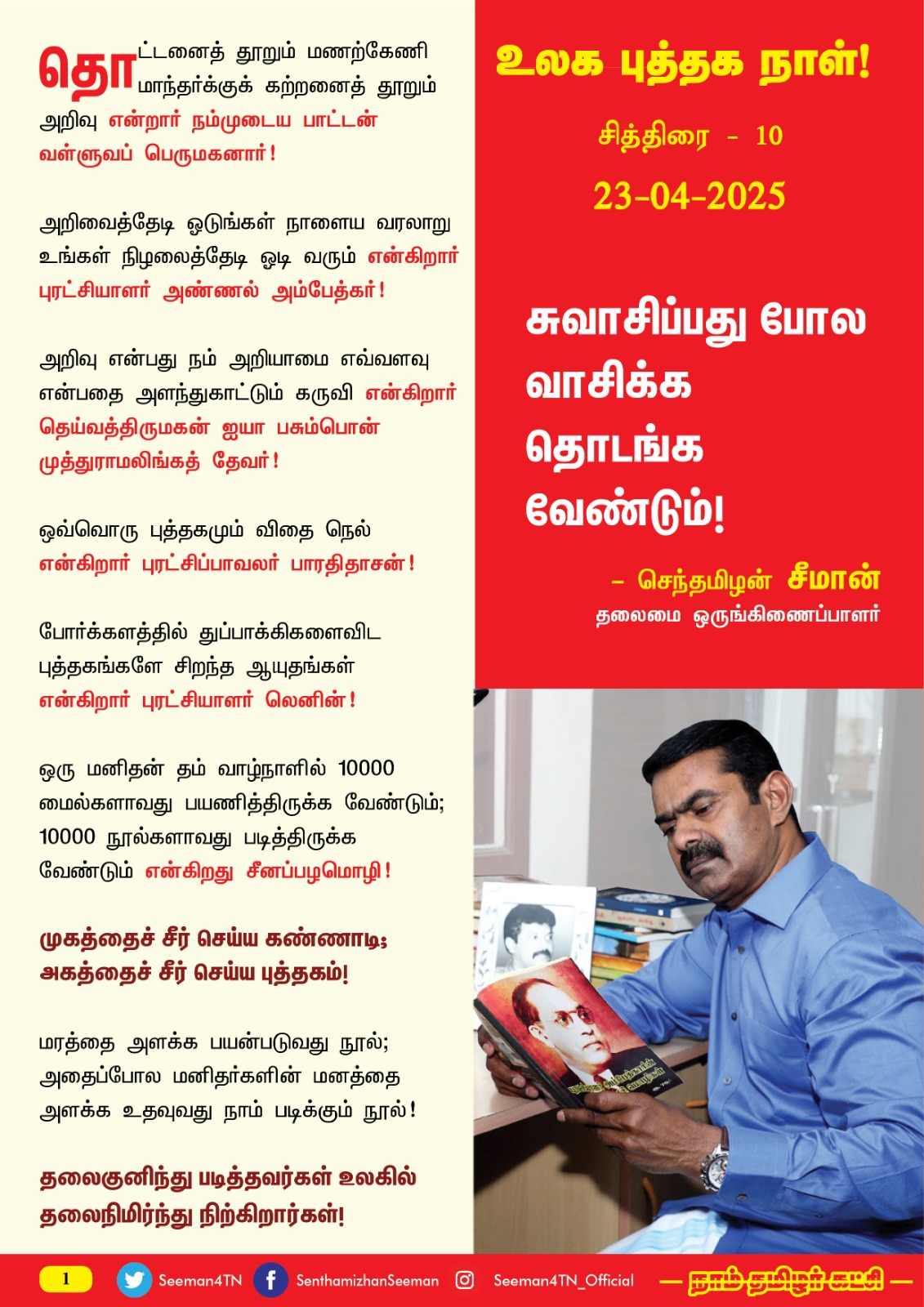எனவே, என்னரும் தம்பி தங்கைகள் அனைவரும் சுவாசிப்பது போல வாசிக்கும் பழக்கத்தை ஏற்படுத்திக்கொள்ள வேண்டும்! அதுதான் உலகத்தின் உயரத்திற்கு உங்களைக் கொண்டு செல்லும்! முன்னை விட இன்னும் வீரியமாக, ஆழமாக நூல்களை வாசிக்க இன்றைய நாள் முதல் தொடங்குவோம் என உறுதியேற்போம்!