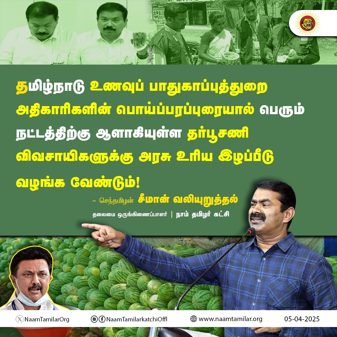 தமிழ்நாடு உணவுப் பாதுகாப்புத்துறை அதிகாரிகளின் பொய்ப் பரப்புரையால் பெரும் நட்டத்திற்கு ஆளாகியுள்ள தர்பூசணி விவசாயிகளுக்கு அரசு உரிய இழப்பீடு வழங்க வேண்டும்! – சீமான் வலியுறுத்தல்
