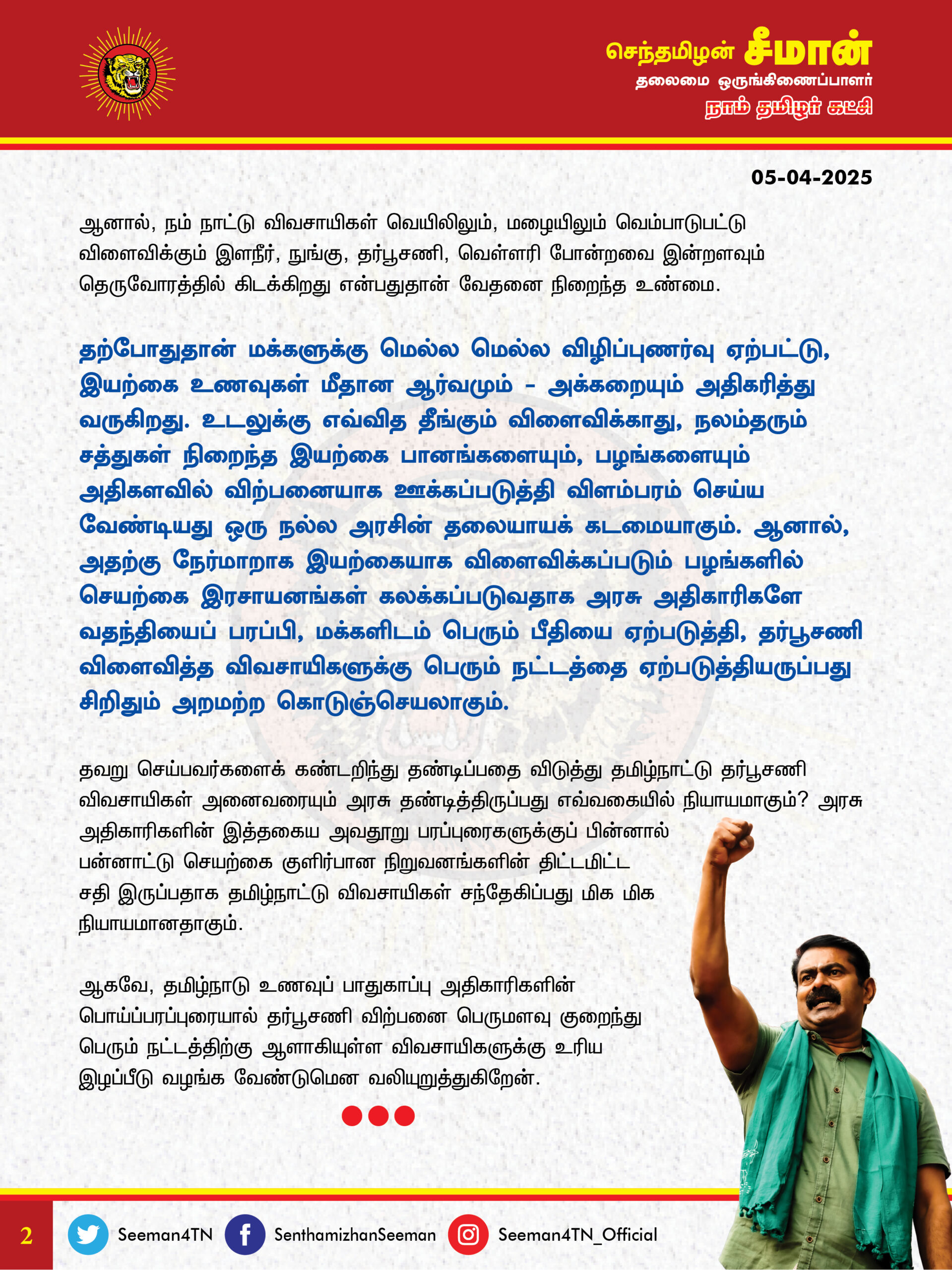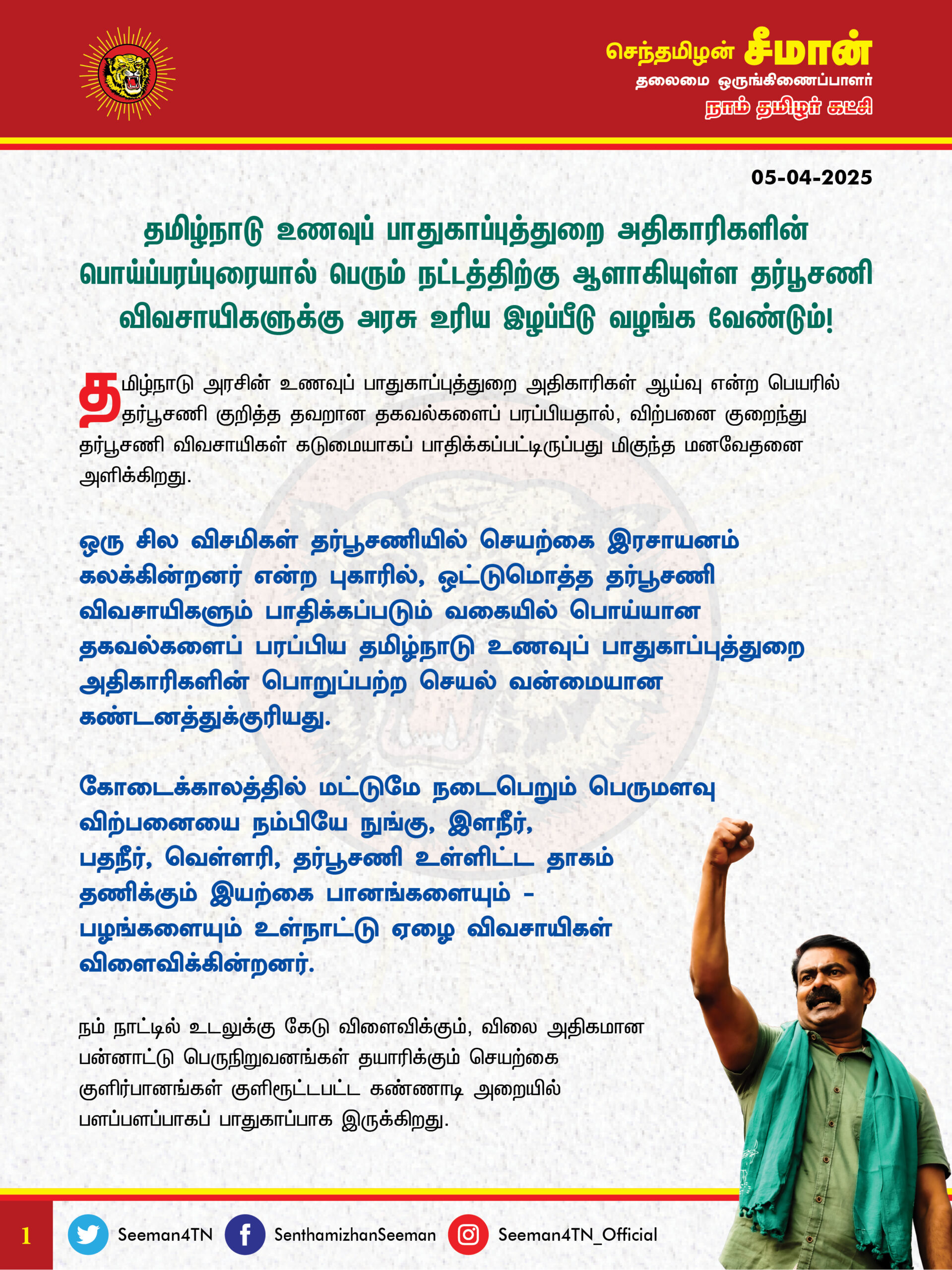 ஒரு சில விசமிகள் தர்பூசணியில் செயற்கை இரசாயனம் கலக்கின்றனர் என்ற புகாரில், ஒட்டுமொத்த தர்பூசணி விவசாயிகளும் பாதிக்கப்படும் வகையில் பொய்யான தகவல்களைப் பரப்பிய தமிழ்நாடு உணவுப் பாதுகாப்புத்துறை அதிகாரிகளின் பொறுப்பற்ற செயல் வன்மையான கண்டனத்துக்குரியது.