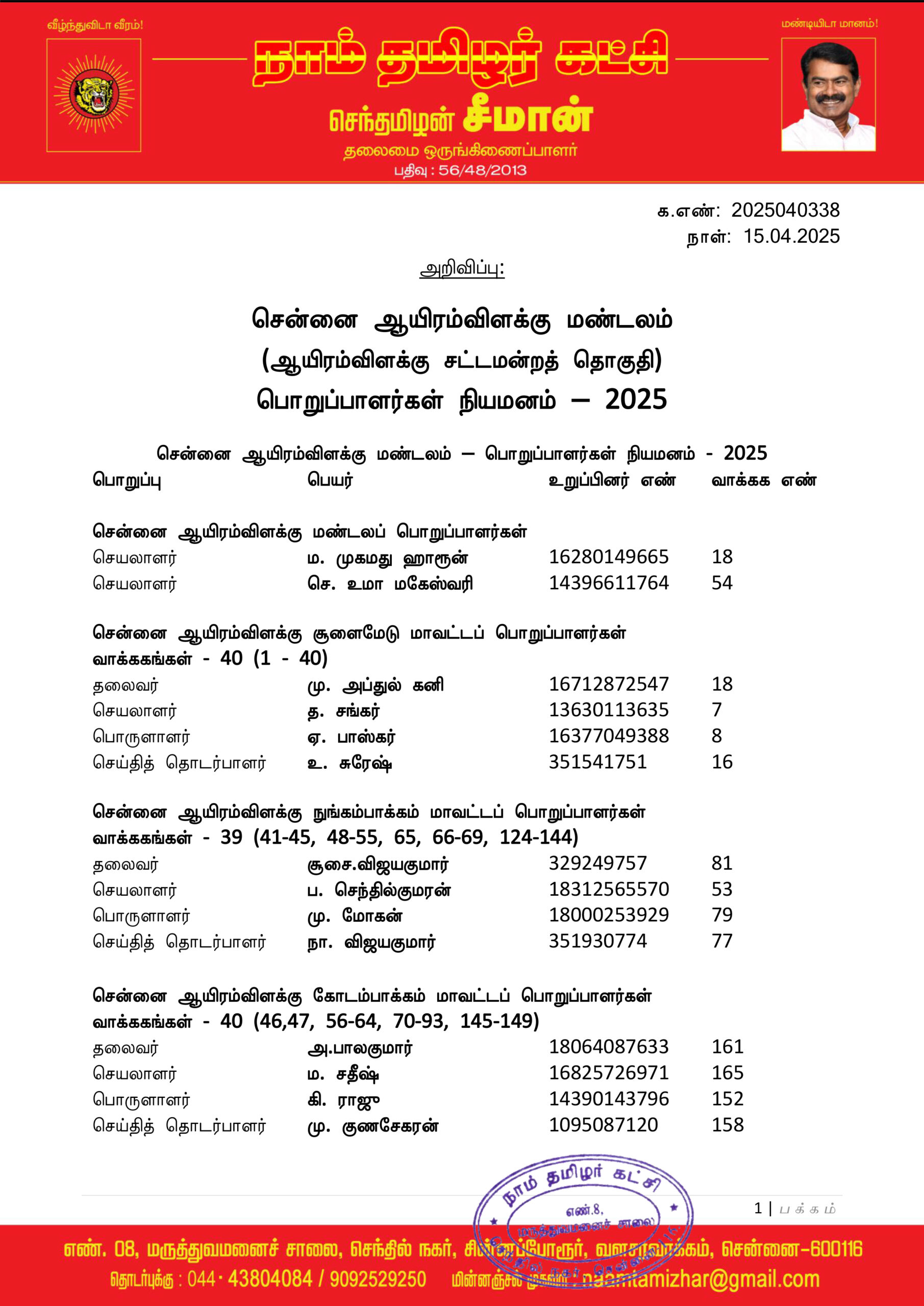 மேற்காண் அனைவரும் நாம் தமிழர் கட்சி – சென்னை ஆயிரம்விளக்கு மண்டலத்திற்குட்பட்ட பொறுப்பாளர்களாக நியமிக்கப்படுகிறார்கள். இவர்கள் அனைவருக்கும், கட்சியின் அனைத்துநிலைப் பொறுப்பாளர்களும், அன்பு உறவுகள் அனைவரும் முழு ஒத்துழைப்பு நல்குமாறு அன்போடு கேட்டுக் கொள்ளப்படுகிறார்கள்.
