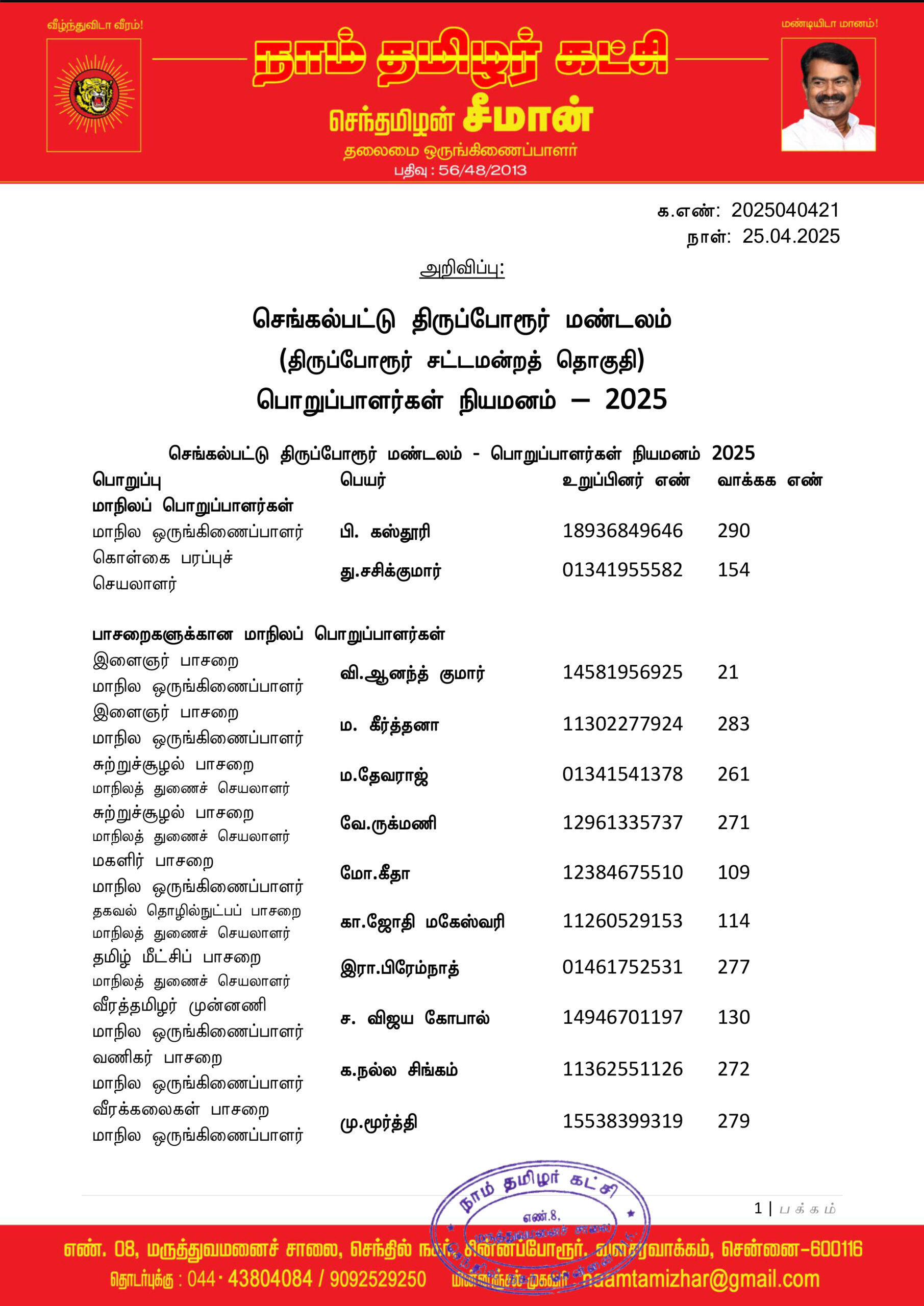 மேற்காண் அனைவரும் நாம் தமிழர் கட்சி – செங்கல்பட்டு திருப்போரூர் மண்டலத்திற்குட்பட்ட பொறுப்பாளர்களாக நியமிக்கப்படுகிறார்கள். இவர்கள் அனைவருக்கும், கட்சியின் அனைத்துநிலைப் பொறுப்பாளர்களும், அன்பு உறவுகள் அனைவரும் முழு ஒத்துழைப்பு நல்குமாறு அன்போடு கேட்டுக் கொள்ளப்படுகிறார்கள்.
