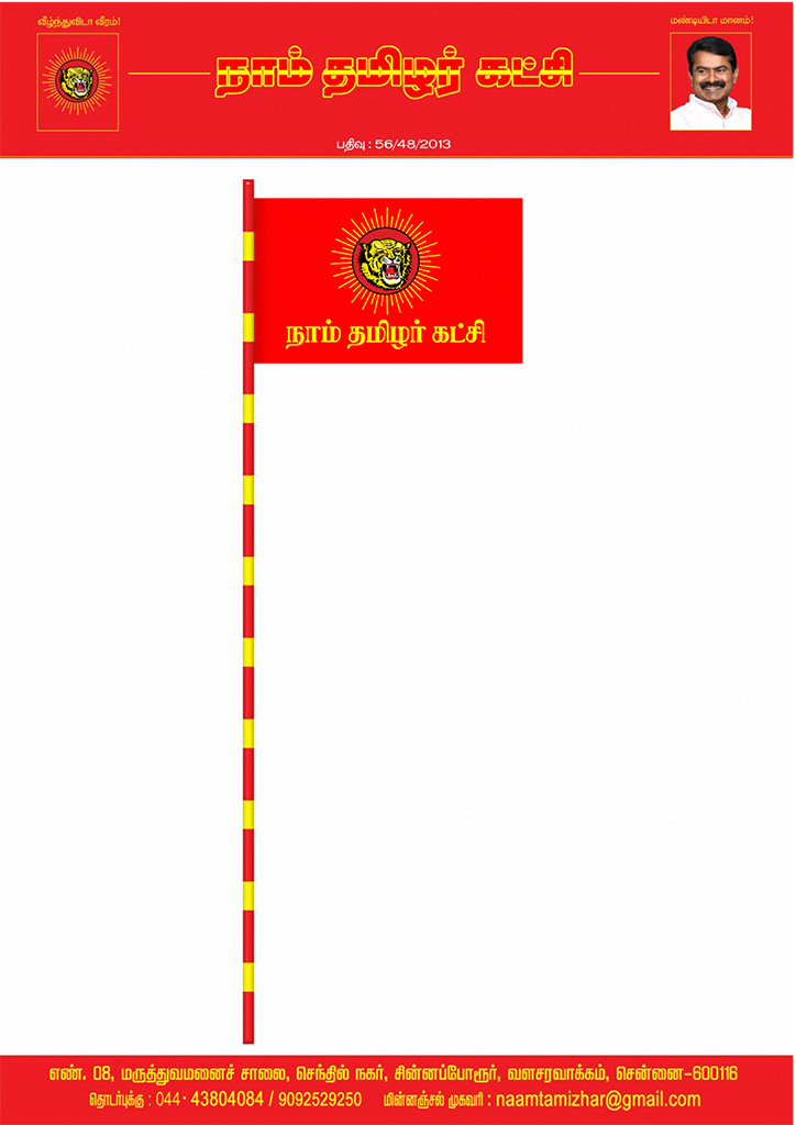 தலைமை அலுவலகத்தில் இருந்து அதிகாரப்பூர்வமாக வெளியிடப்பட்டுள்ள கட்சியின் புலிக்கொடி வடிவமைப்பை (www.naamtamilar.org/category/downloads/) கட்சி இணையதளத்தில் இருந்து தரவிறக்கம் செய்து, தேவைக்கேற்ற அளவுகளில் புதிதாக அச்சடித்து பயன்படுத்துமாறு கேட்டுக்கொள்ளப்படுகிறார்கள்.
