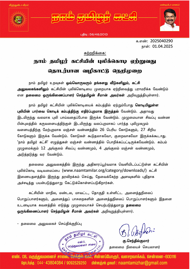 நாம் தமிழர் உறவுகள் ஒவ்வொருவரும் தங்களது வீடுகளிலும், கட்சி அலுவலகங்களிலும் கட்சியின் புலிக்கொடியை முறையாக ஏற்றிவைத்து பராமரிக்க வேண்டும் என தலைமை ஒருங்கிணைப்பாளர் செந்தமிழன் சீமான் அவர்கள் அறிவுறுத்தியுள்ளார்.