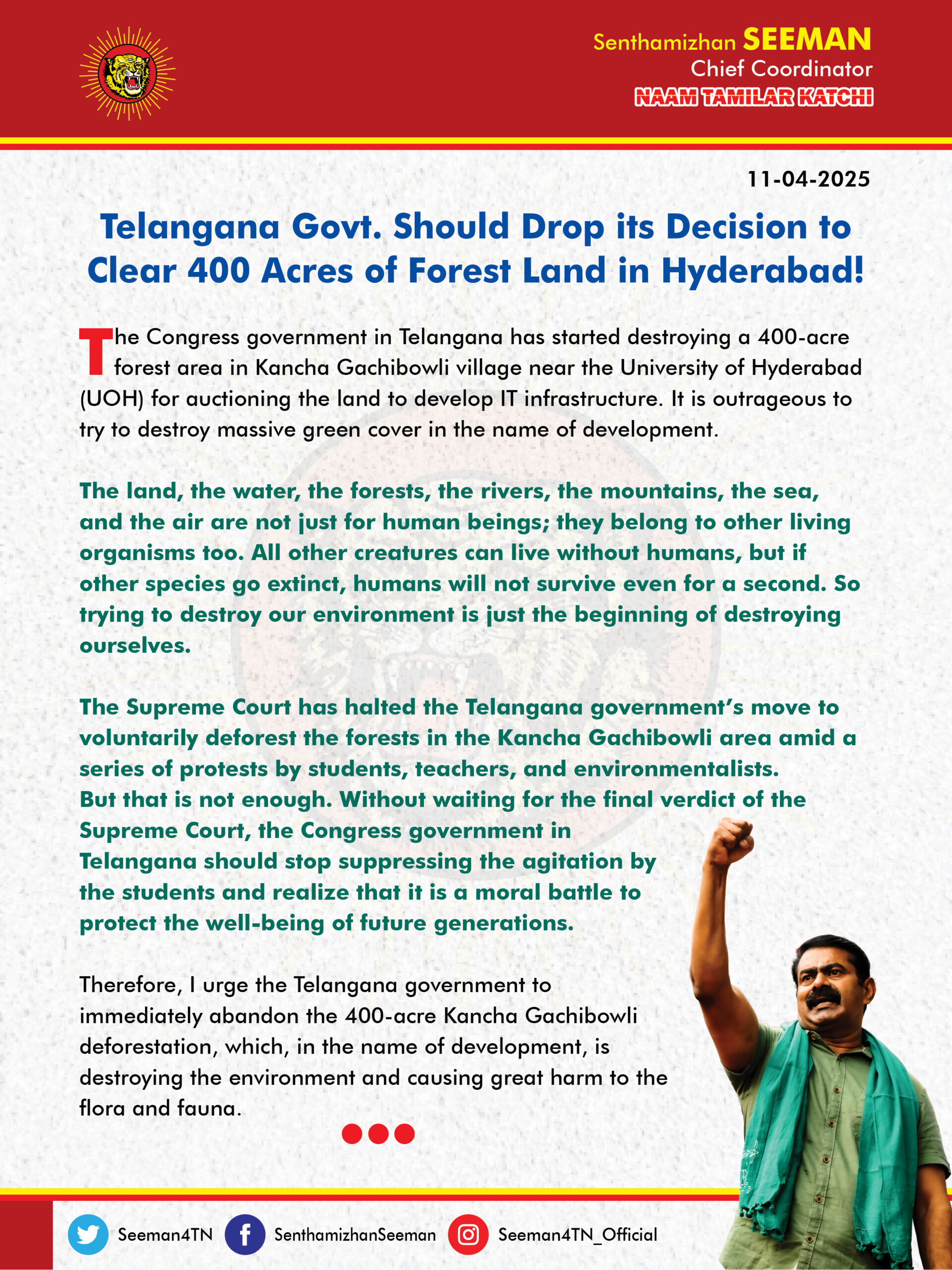 Telangana Govt. Should Drop its Decision to Clear 400 Acres of Forest Land in Hyderabad! – Seeman