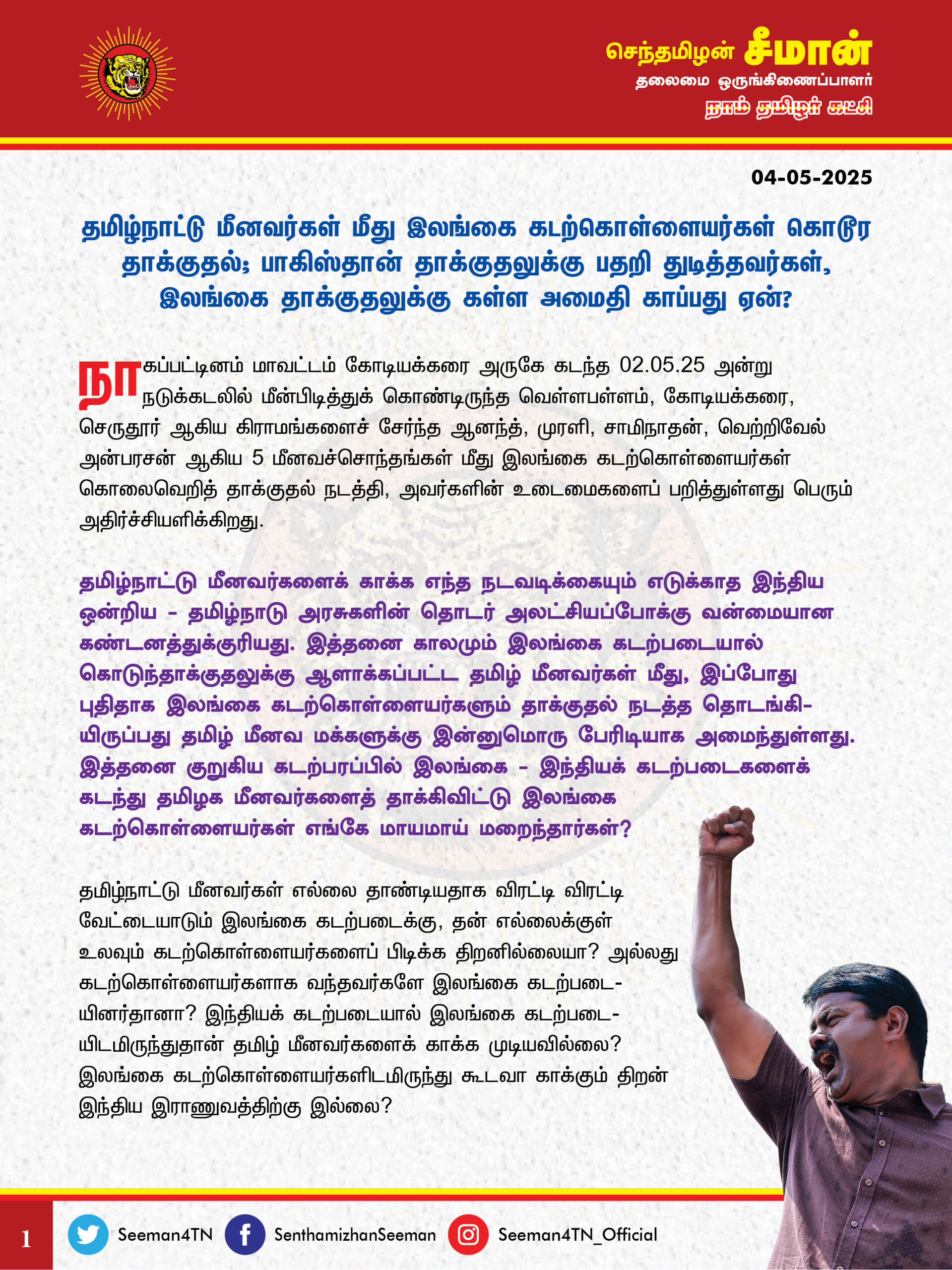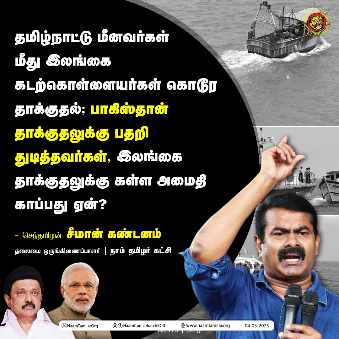 பாகிஸ்தானைச் சேர்ந்த பயங்கரவாதிகள் எல்லை தாண்டி இந்திய நாட்டு குடிகள் மீது தாக்குதல் நடத்தியவுடன் பதறி துடித்த பெருமக்கள், இலங்கை கடற்கொள்ளையர்கள் எல்லை தாண்டி தமிழ் மீனவர்கள் மீது தாக்குதல் நடத்தியுள்ளதற்கு எந்த பதற்றமும் கொள்ளாமல் கள்ள அமைதி காப்பது ஏன்? தமிழர்கள் இந்த நாட்டின் குடிகள் இல்லையா? அல்லது உயிரிழப்புகள் நிகழ்ந்தால்தான் அதுபற்றி பேசுவீர்களா? அல்லது கோபமும், இரக்கமும்கூட எந்த நாடு தாக்கியது? தாக்கப்பட்ட மக்கள் யார் என்பதெல்லாம் பார்த்துதான் வருமா? என்று அடுக்கடுக்காய் எழும் கேள்விகளுக்கு இந்த நாட்டை ஆளும் ஆட்சியாளர்களிடம் பதிலுண்டா?