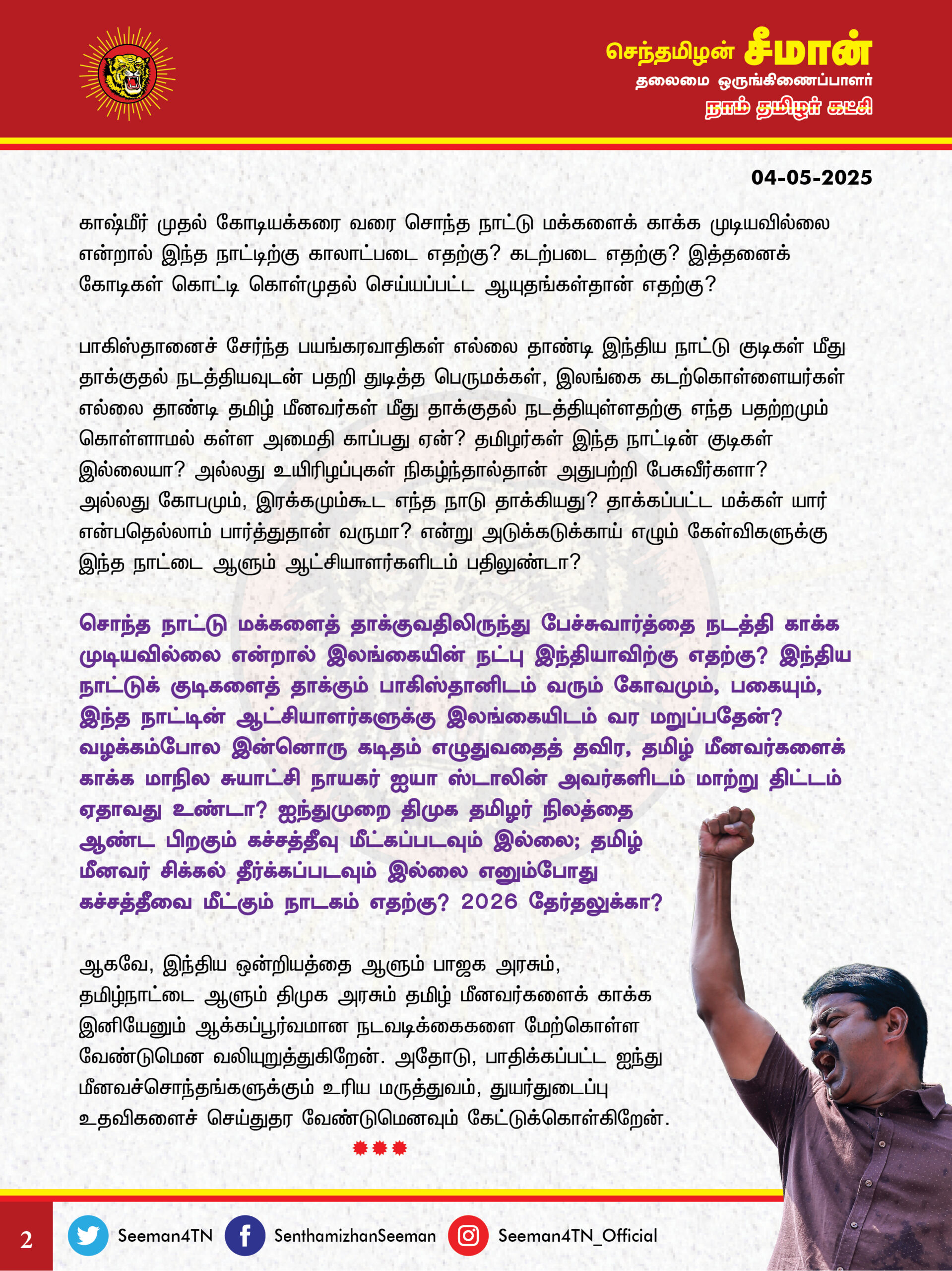 வழக்கம்போல இன்னொரு கடிதம் எழுதுவதைத் தவிர, தமிழ் மீனவர்களைக் காக்க மாநில சுயாட்சி நாயகர் ஐயா ஸ்டாலின் அவர்களிடம் மாற்று திட்டம் ஏதாவது உண்டா? ஐந்துமுறை திமுக தமிழர் நிலத்தை ஆண்ட பிறகும் கச்சத்தீவு மீட்கப்படவும் இல்லை; தமிழ் மீனவர் சிக்கல் தீர்க்கப்படவும் இல்லை எனும்போது கச்சத்தீவை மீட்கும் நாடகம் எதற்கு? 2026 தேர்தலுக்கா?