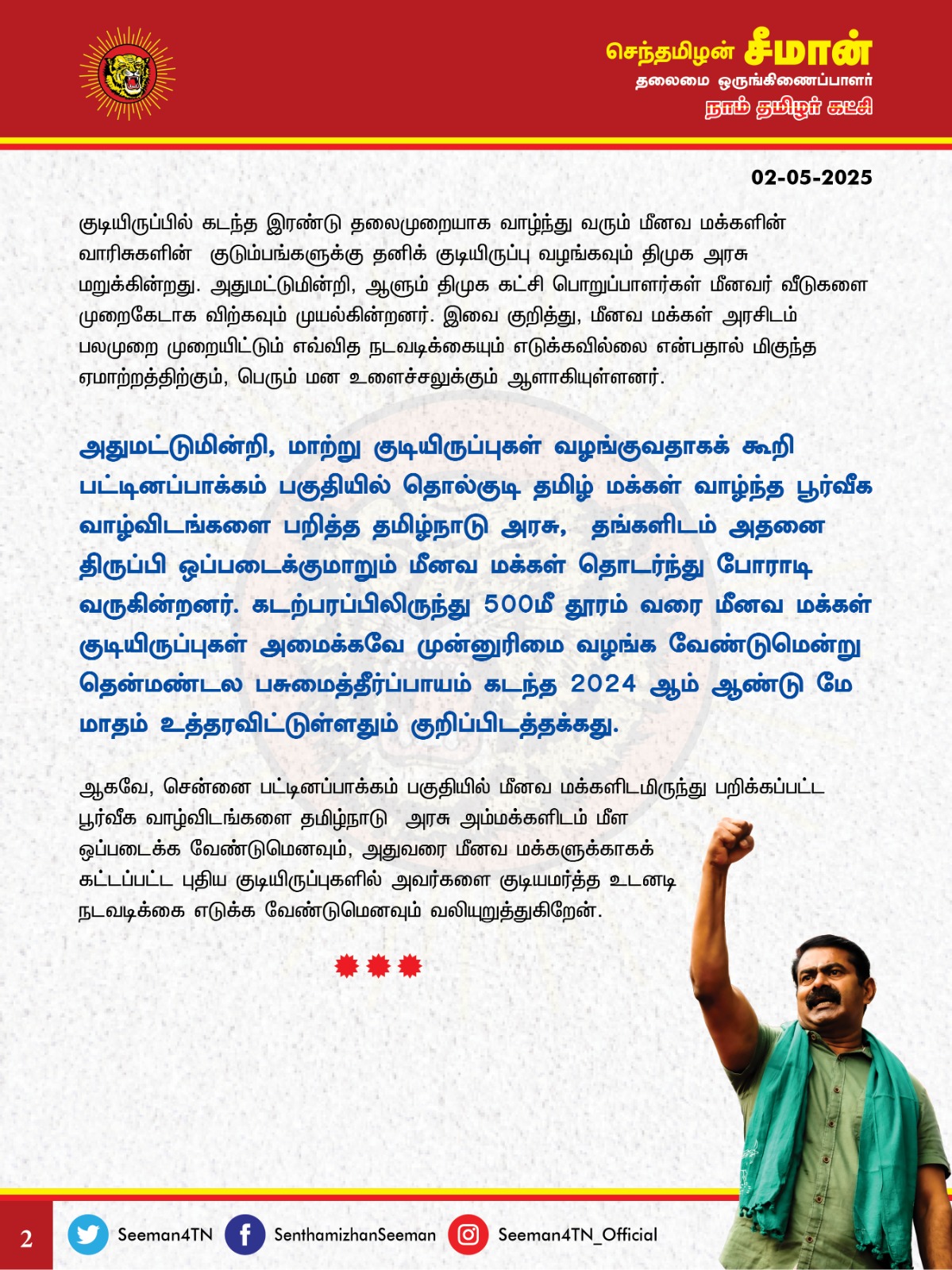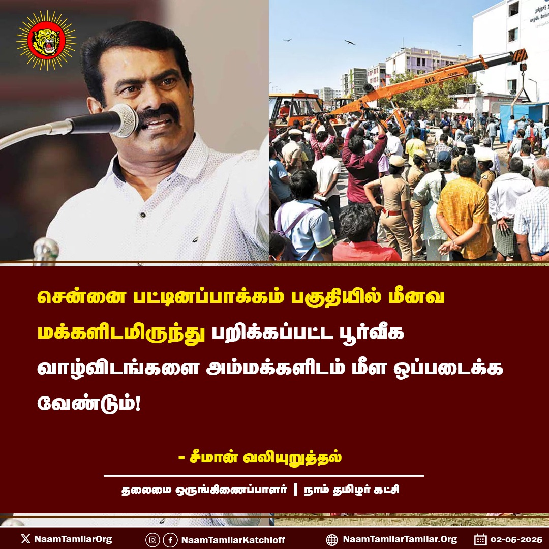 ஆகவே, சென்னை பட்டினப்பாக்கம் பகுதியில் மீனவ மக்களிடமிருந்து பறிக்கப்பட்ட பூர்வீக வாழ்விடங்களை தமிழ்நாடு அரசு அம்மக்களிடம் மீள ஒப்படைக்க வேண்டுமெனவும், அதுவரை மீனவ மக்களுக்காகக் கட்டப்பட்ட புதிய குடியிருப்புகளில் அவர்களை குடியமர்த்த உடனடி நடவடிக்கை எடுக்க வேண்டுமெனவும் வலியுறுத்துகிறேன்.