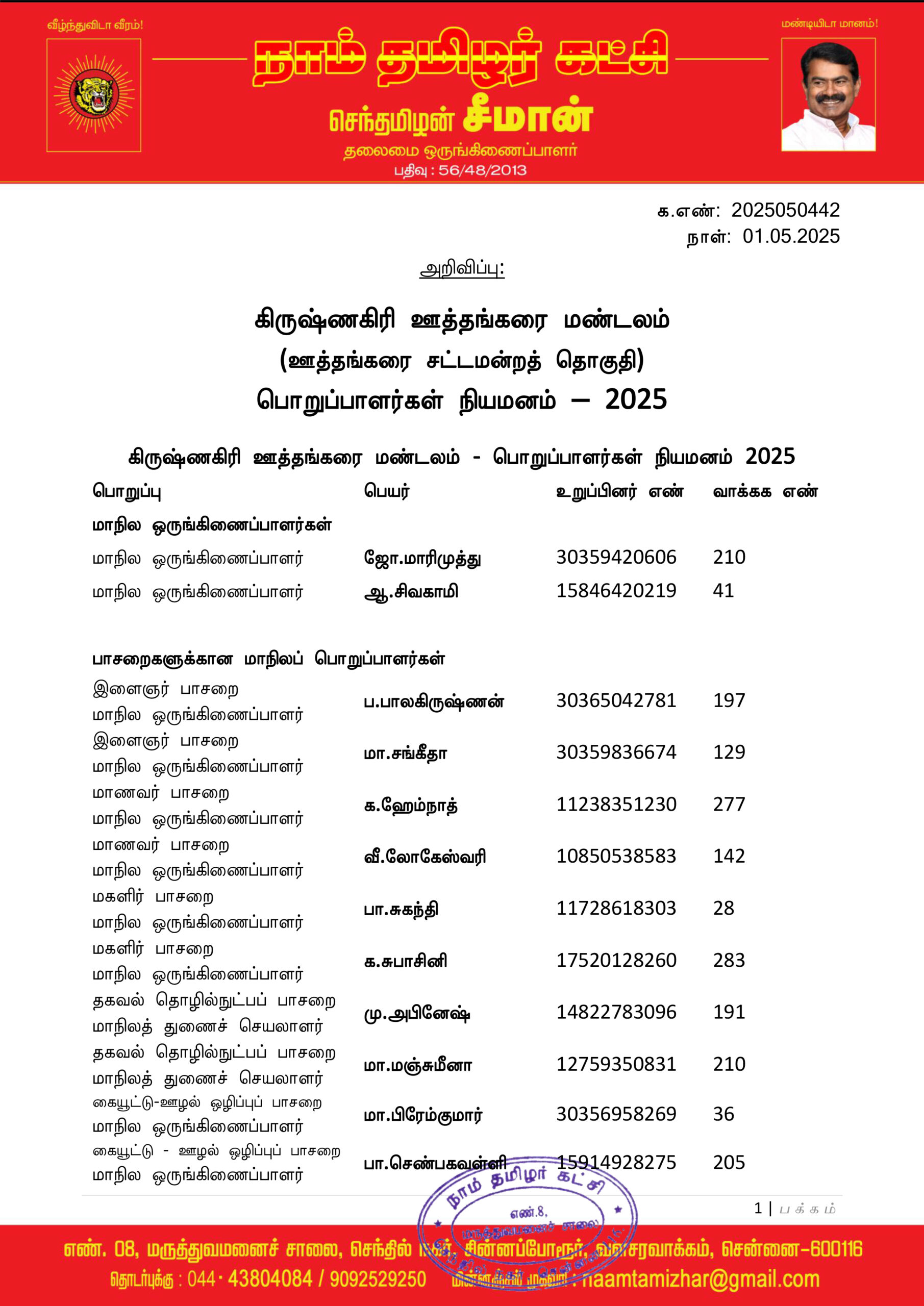 மேற்காண் அனைவரும் நாம் தமிழர் கட்சி – கிருஷ்ணகிரி ஊத்தங்கரை மண்டலத்திற்குட்பட்ட பொறுப்பாளர்களாக நியமிக்கப்படுகிறார்கள். இவர்கள் அனைவருக்கும், கட்சியின் அனைத்துநிலைப் பொறுப்பாளர்களும், அன்பு உறவுகள் அனைவரும் முழு ஒத்துழைப்பு நல்குமாறு அன்போடு கேட்டுக் கொள்ளப்படுகிறார்கள்.