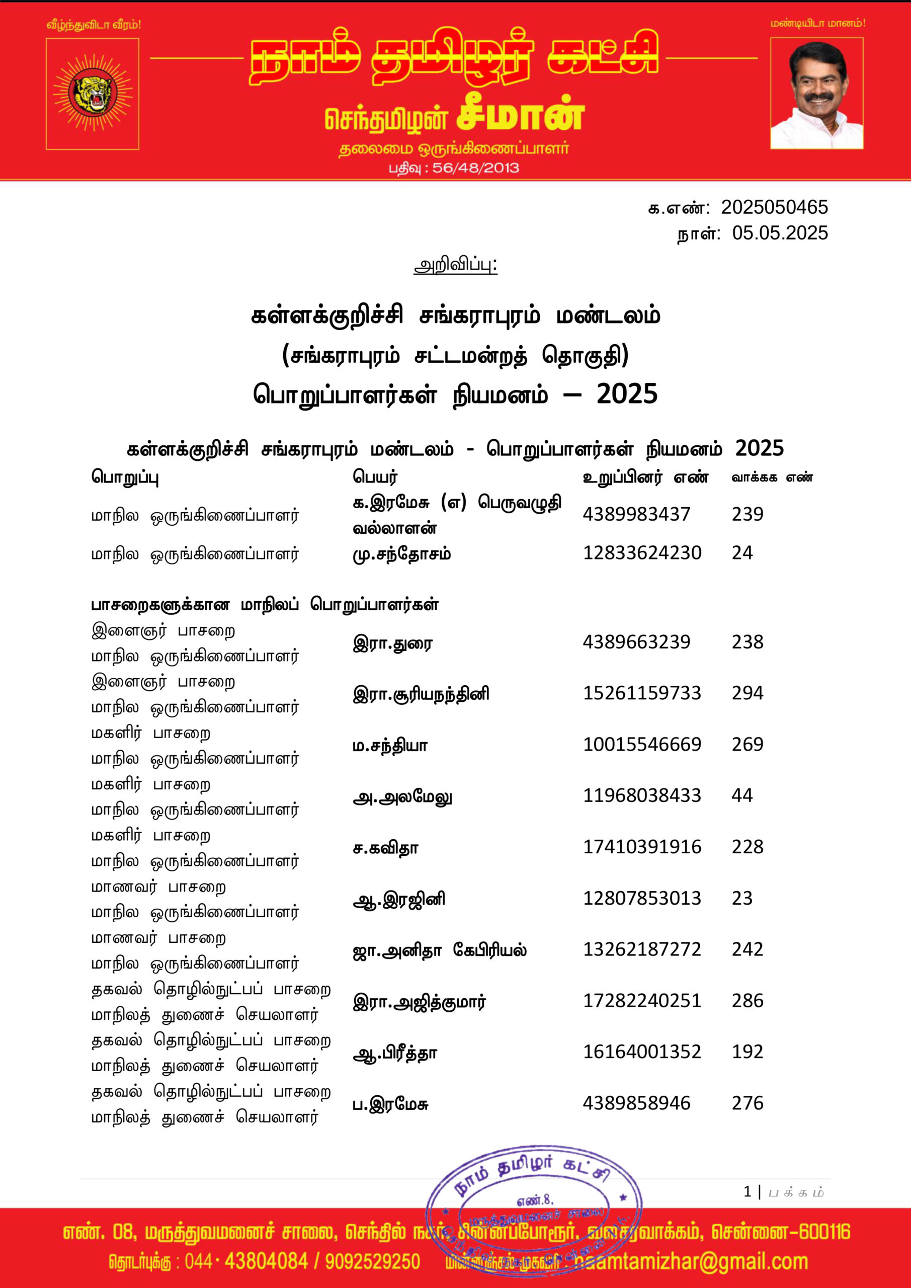 மேற்காண் அனைவரும் நாம் தமிழர் கட்சி – கள்ளக்குறிச்சி சங்கராபுரம் மண்டலத்திற்குட்பட்ட பொறுப்பாளர்களாக நியமிக்கப்படுகிறார்கள். இவர்கள் அனைவருக்கும், கட்சியின் அனைத்துநிலைப் பொறுப்பாளர்களும், அன்பு உறவுகள் அனைவரும் முழு ஒத்துழைப்பு நல்குமாறு அன்போடு கேட்டுக் கொள்ளப்படுகிறார்கள்.