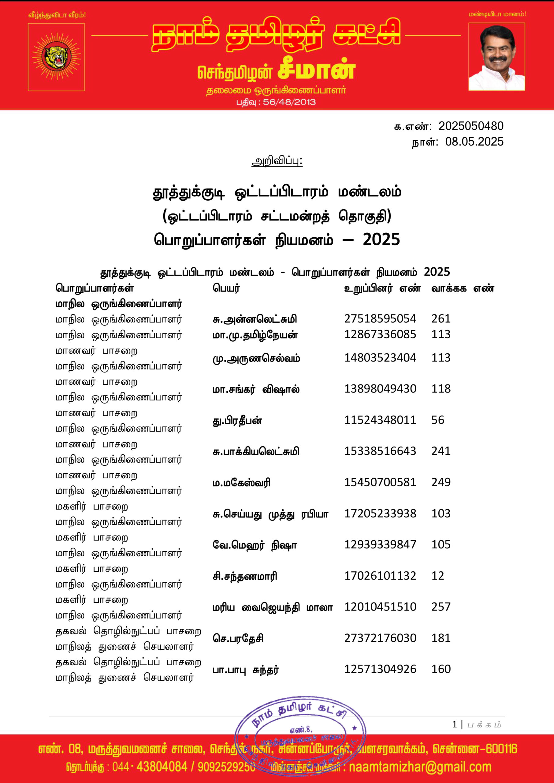 மேற்காண் அனைவரும் நாம் தமிழர் கட்சி – தூத்துக்குடி ஒட்டப்பிடாரம் மண்டலத்திற்குட்பட்ட பொறுப்பாளர்களாக நியமிக்கப்படுகிறார்கள்.இவர்கள் அனைவருக்கும், கட்சியின் அனைத்துநிலைப் பொறுப்பாளர்களும், அன்பு உறவுகள் அனைவரும் முழு ஒத்துழைப்பு நல்குமாறு அன்போடு கேட்டுக் கொள்ளப்படுகிறார்கள்.