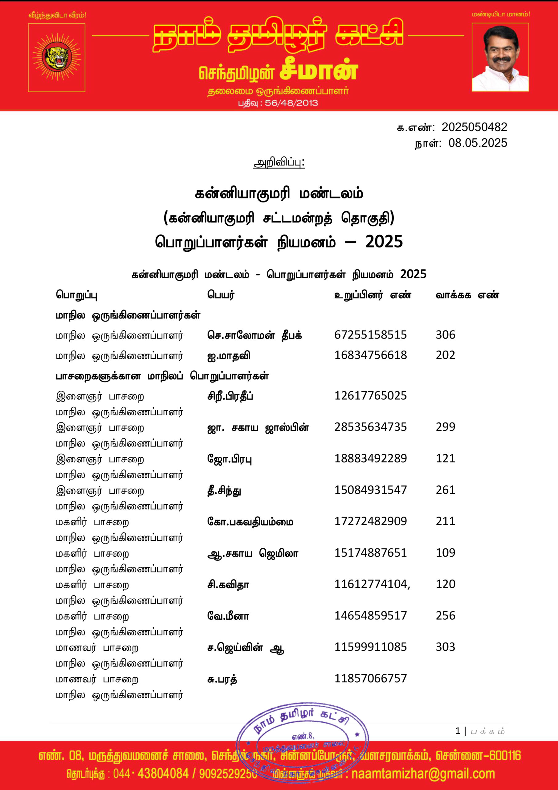 மேற்காண் அனைவரும் நாம் தமிழர் கட்சி – கன்னியாகுமரி மண்டலத்திற்குட்பட்ட பொறுப்பாளர்களாக நியமிக்கப்படுகிறார்கள்.இவர்கள் அனைவருக்கும், கட்சியின் அனைத்துநிலைப் பொறுப்பாளர்களும், அன்பு உறவுகள் அனைவரும் முழு ஒத்துழைப்பு நல்குமாறு அன்போடு கேட்டுக் கொள்ளப்படுகிறார்கள்.