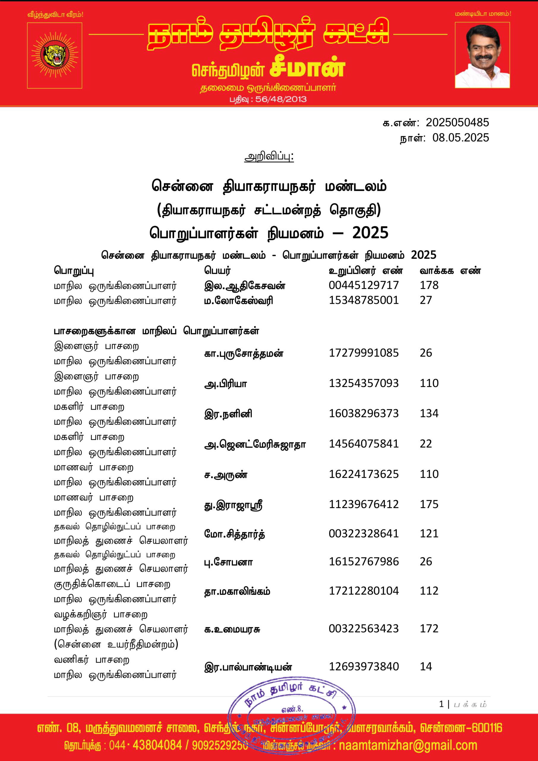 மேற்காண் அனைவரும் நாம் தமிழர் கட்சி – சென்னை தியாகராயநகர் மண்டலத்திற்குட்பட்ட பொறுப்பாளர்களாக நியமிக்கப்படுகிறார்கள்.இவர்கள் அனைவருக்கும், கட்சியின் அனைத்துநிலைப் பொறுப்பாளர்களும், அன்பு உறவுகள் அனைவரும் முழு ஒத்துழைப்பு நல்குமாறு அன்போடு கேட்டுக் கொள்ளப்படுகிறார்கள்.