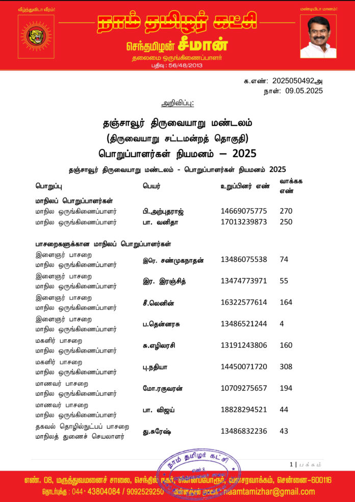 மேற்காண் அனைவரும் நாம் தமிழர் கட்சி – தஞ்சாவூர் திருவையாறு மண்டலத்திற்குட்பட்ட பொறுப்பாளர்களாக நியமிக்கப்படுகிறார்கள். இவர்கள் அனைவருக்கும், கட்சியின் அனைத்துநிலைப் பொறுப்பாளர்களும், அன்பு உறவுகள் அனைவரும் முழு ஒத்துழைப்பு நல்குமாறு அன்போடு கேட்டுக் கொள்ளப்படுகிறார்கள்.