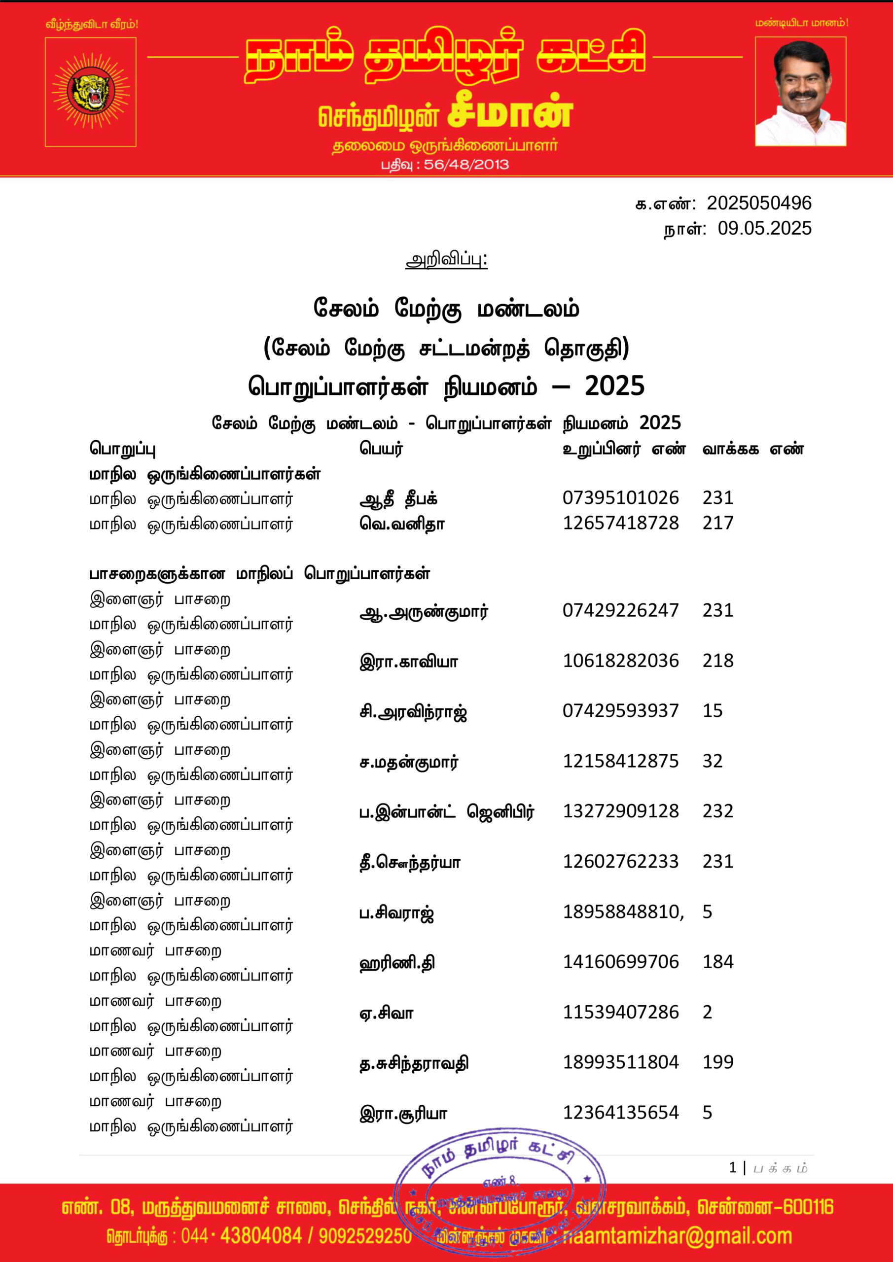 மேற்காண் அனைவரும் நாம் தமிழர் கட்சி – சேலம் மேற்கு மண்டலத்திற்குட்பட்ட பொறுப்பாளர்களாக நியமிக்கப்படுகிறார்கள். இவர்கள் அனைவருக்கும், கட்சியின் அனைத்துநிலைப் பொறுப்பாளர்களும், அன்பு உறவுகள் அனைவரும் முழு ஒத்துழைப்பு நல்குமாறு அன்போடு கேட்டுக் கொள்ளப்படுகிறார்கள்.