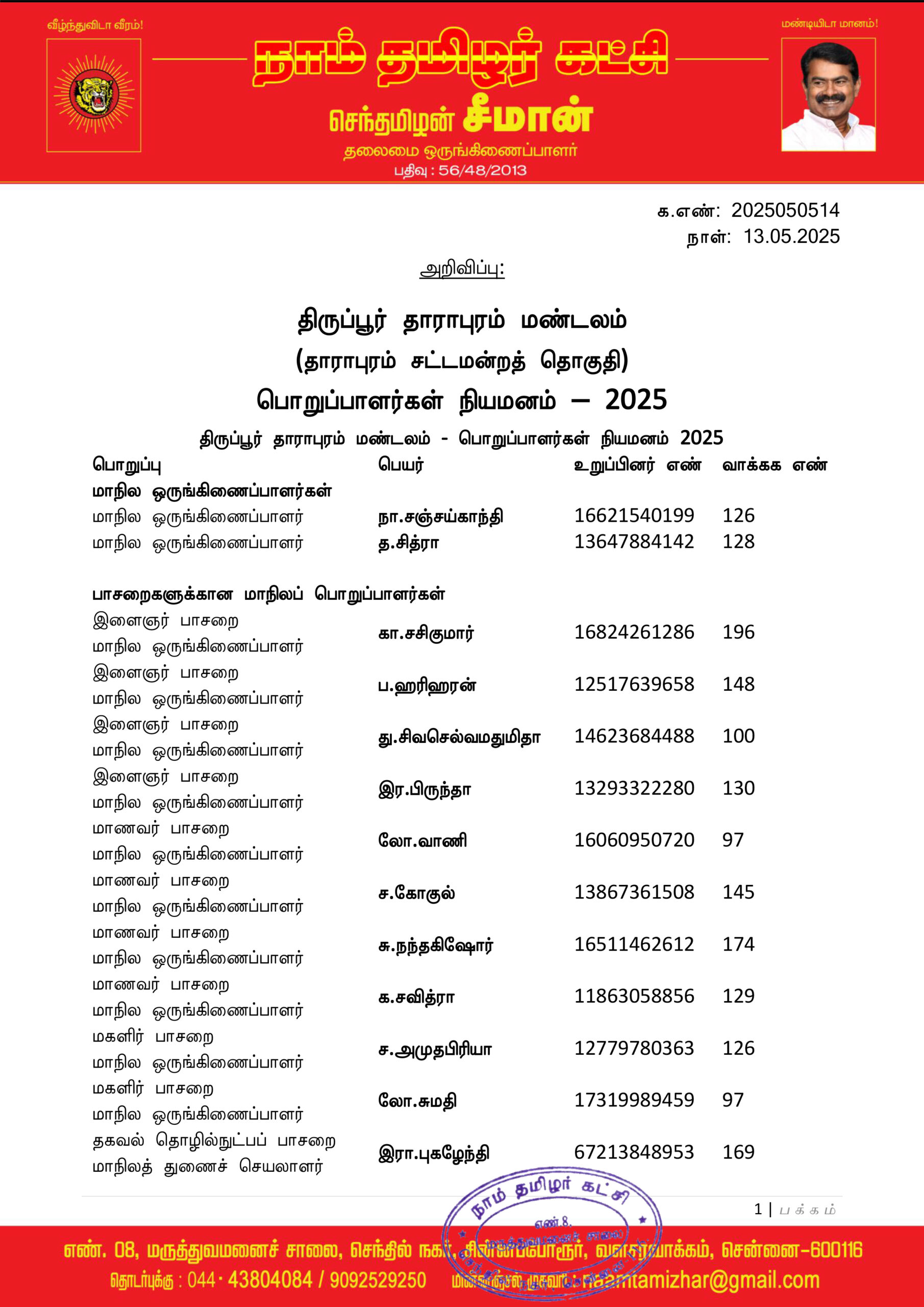 மேற்காண் அனைவரும் நாம் தமிழர் கட்சி – திருப்பூர் தாராபுரம் மண்டலத்திற்குட்பட்ட பொறுப்பாளர்களாக நியமிக்கப்படுகிறார்கள். இவர்கள் அனைவருக்கும், கட்சியின் அனைத்துநிலைப் பொறுப்பாளர்களும், அன்பு உறவுகள் அனைவரும் முழு ஒத்துழைப்பு நல்குமாறு அன்போடு கேட்டுக் கொள்ளப்படுகிறார்கள்.