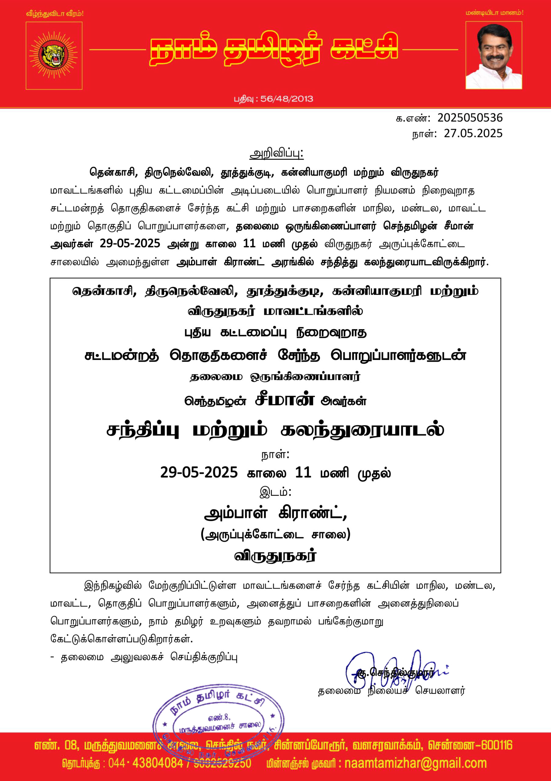 | தென்காசி, திருநெல்வேலி, தூத்துக்குடி, கன்னியாகுமரி மற்றும் விருதுநகர் மாவட்டங்களில் புதிய கட்டமைப்பு நிறைவுறாத சட்டமன்றத் தொகுதிகளைச் சேர்ந்த பொறுப்பாளர்களுடன் தலைமை ஒருங்கிணைப்பாளர் செந்தமிழன் சீமான் அவர்கள் சந்திப்பு மற்றும் கலந்துரையாடல் நாள்: 29-05-2025 காலை 11 மணி முதல் இடம்: |