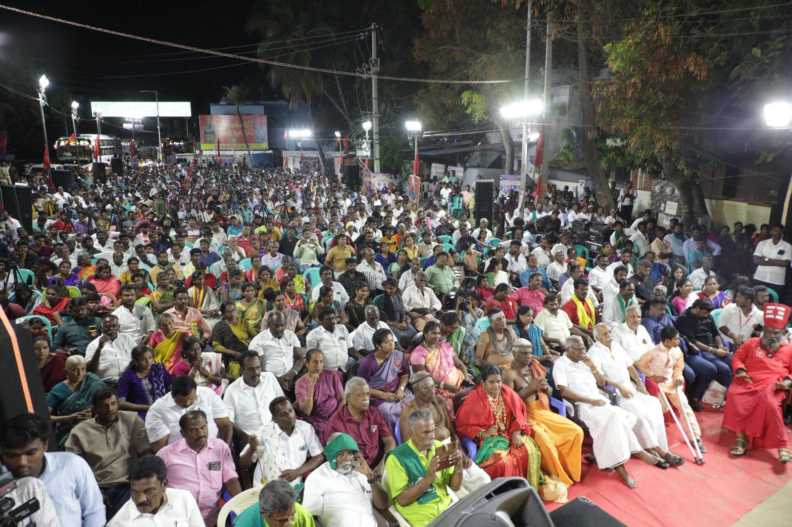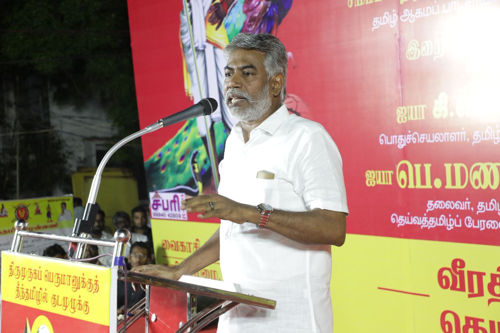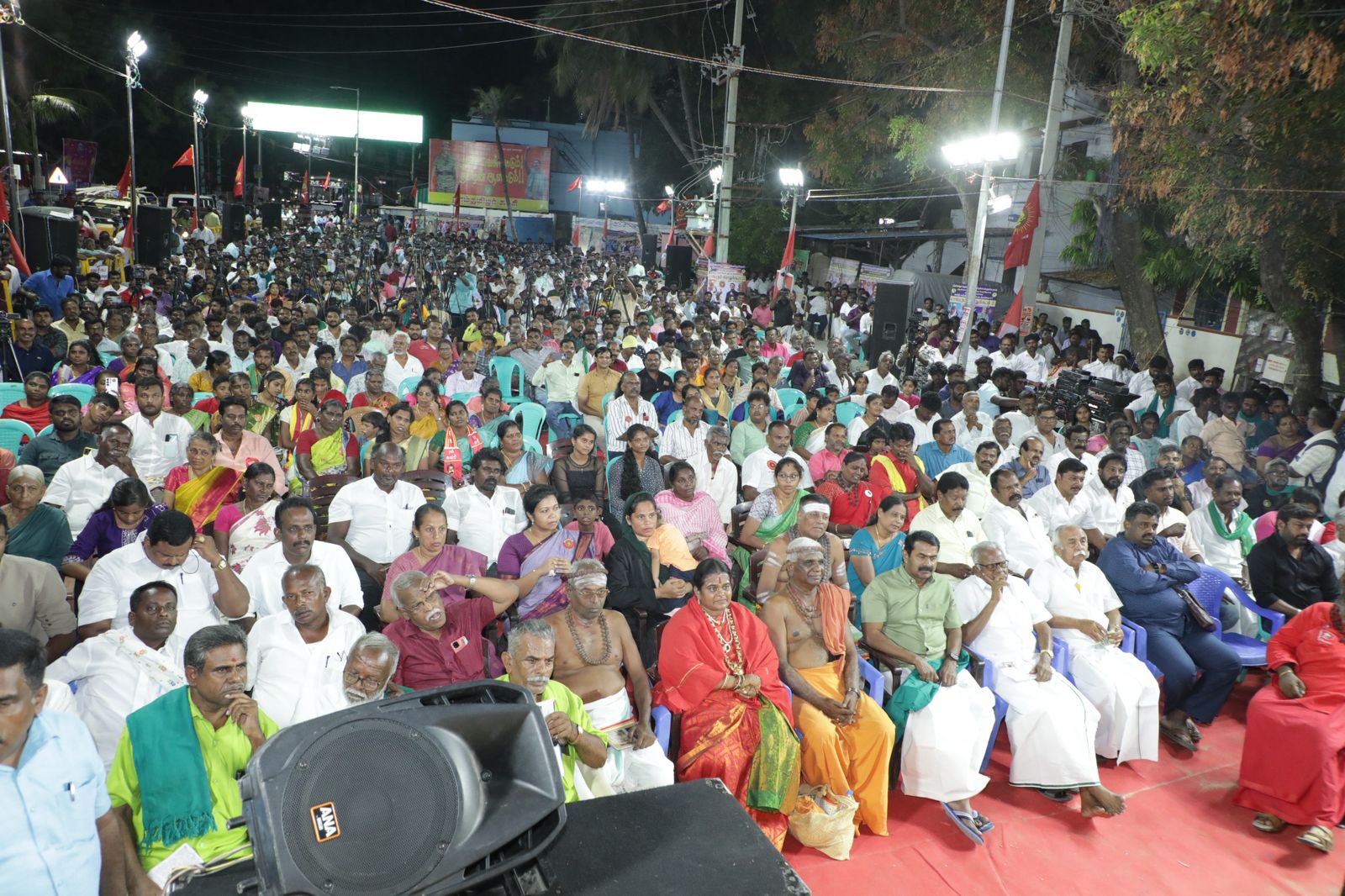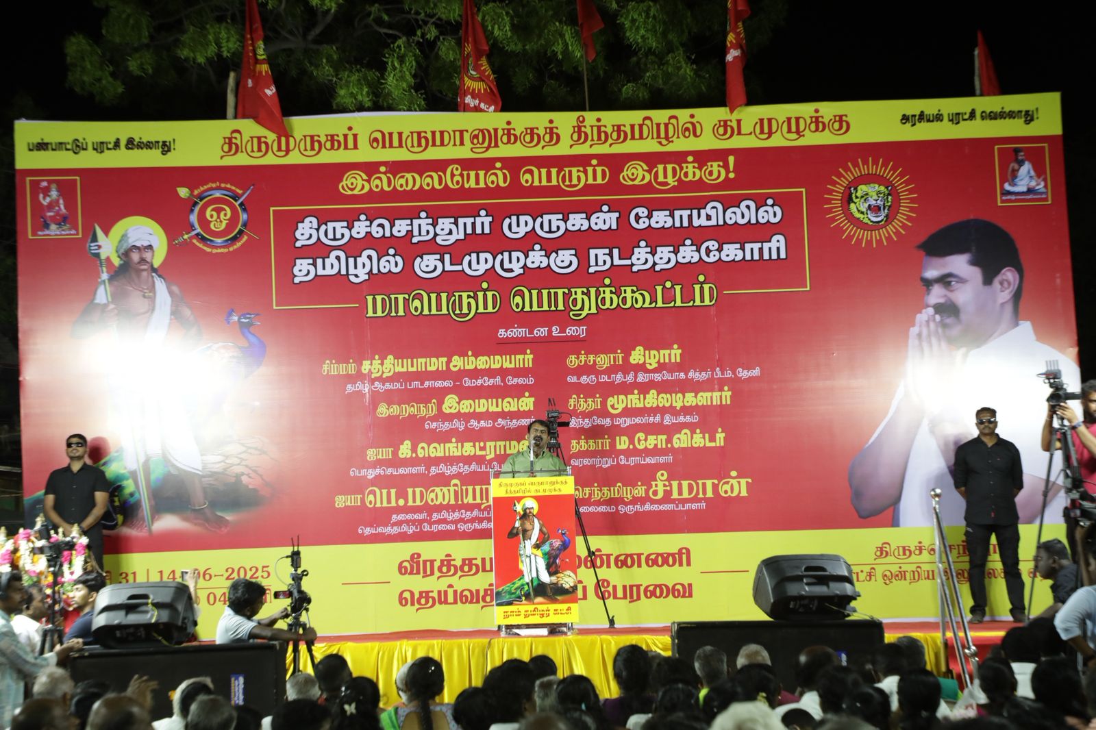 திருச்செந்தூரில் திருமுருகனுக்குத் தீந்தமிழில் குடமுழுக்கு நடத்தக்கோரி, ஐயா பெ.மணியரசன் மற்றும் செந்தமிழன் சீமான் அவர்கள் தலைமையில், 14-06-2025 அன்று, திருசெந்தூர் ஊராட்சி ஒன்றிய அலுவலகம் எதிரில் மாபெரும் பொதுக்கூட்டம் நடைபெற்றது!