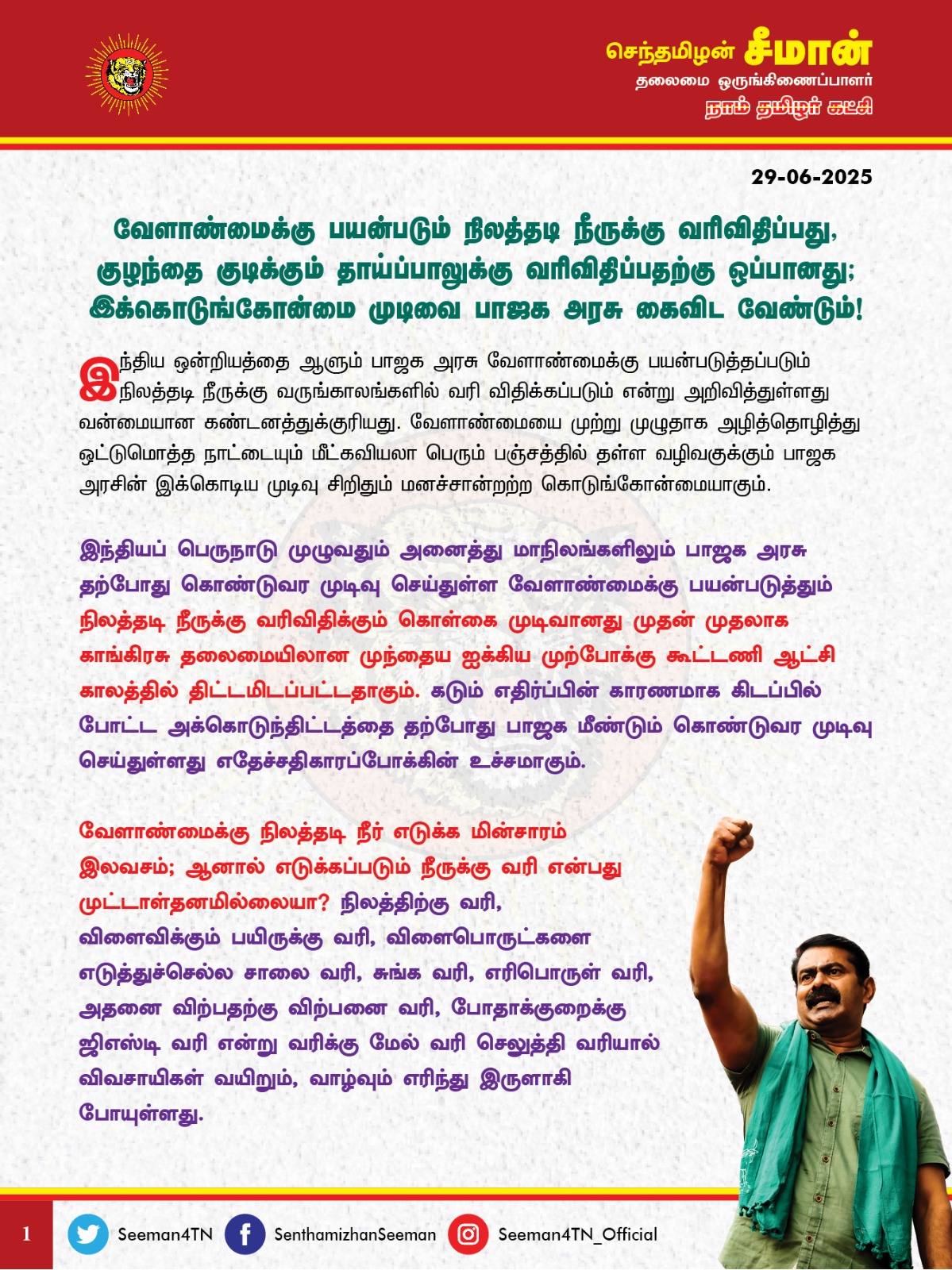 ஏற்கனவே இடுபொருட்கள், விதை, உரம், பூச்சிக்கொல்லி, களைக்கொல்லி மருந்துகளின் விலையேற்றம், வேலையாட்கள் பற்றாக்குறை, கூலி உயர்வு, புழு தாக்கம், பருவகால மாற்றம் என பல்வேறு தடைகள் சூழ்ந்து, வேளாண்மை செய்வதே விவசாயிகளுக்கு தற்காலத்தில் பெரும்பாடாகியுள்ளது. அத்தனை துன்பங்களையும் தாண்டி வேளாண்மை செய்து பயிர் விளைவித்தாலும், விளைபொருட்களுக்கு உரிய விலை கிடைக்காத காரணத்தால் பெரும்பான்மையான விவசாயிகள் வேளாண்மையை விட்டே வெளியேறி வருகின்றனர். அதோடு, ஒன்றிய – மாநில அரசுகள் தங்கள் பங்கிற்கு, தொழில் வளர்ச்சி என்ற பெயரில் விளைநிலங்களை விவசாயிகளிடமிருந்து வலுக்கட்டாயமாகப் பறித்தும் வேளாண்மையை அழித்து வருகின்றது. விளைபொருட்களுக்கு குறைந்தபட்ச ஆதார விலை நிர்ணயம் செய்ய வேண்டுமென நெடுங்காலமாக வேளாண் பெருங்குடி மக்கள் கோரிக்கை வைத்து, போராடி வரும் நிலையில், அவற்றையெல்லாம் கண்டுகொள்ளாத இந்திய ஒன்றிய அரசு நிலத்தடி நீருக்கு வரிவிதிப்பது வேளாண்மையை முற்றாக அழிப்பதற்கே வழிவகுக்கும்.