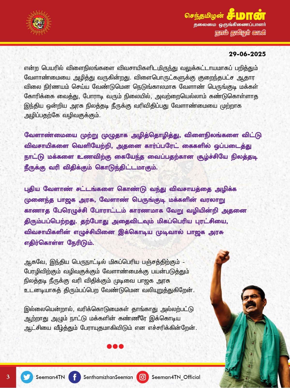 புதிய வேளாண் சட்டங்களை கொண்டு வந்து விவசாயத்தை அழிக்க முனைந்த பாஜக அரசு, வேளாண் பெருங்குடி மக்களின் வரலாறு காணாத பேரெழுச்சி போராட்டம் காரணமாக வேறு வழியின்றி அதனை திரும்பப்பெற்றது. தற்போது அதைவிடவும் மிகப்பெரிய புரட்சியை, விவசாயிகளின் எழுச்சியினை இக்கொடிய முடிவால் பாஜக அரசு எதிர்கொள்ள நேரிடும்.
