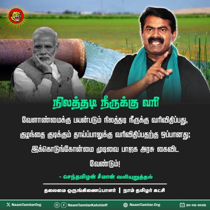 இந்திய ஒன்றியத்தை ஆளும் பாஜக அரசு வேளாண்மைக்கு பயன்படுத்தப்படும் நிலத்தடி நீருக்கு வருங்காலங்களில் வரி விதிக்கப்படும் என்று அறிவித்துள்ளது வன்மையான கண்டனத்துக்குரியது. வேளாண்மையை முற்று முழுதாக அழித்தொழித்து ஒட்டுமொத்த நாட்டையும் மீட்கவியலா பெரும் பஞ்சத்தில் தள்ள வழிவகுக்கும் பாஜக அரசின் இக்கொடிய முடிவு சிறிதும் மனச்சான்றற்ற கொடுங்கோன்மையாகும்.