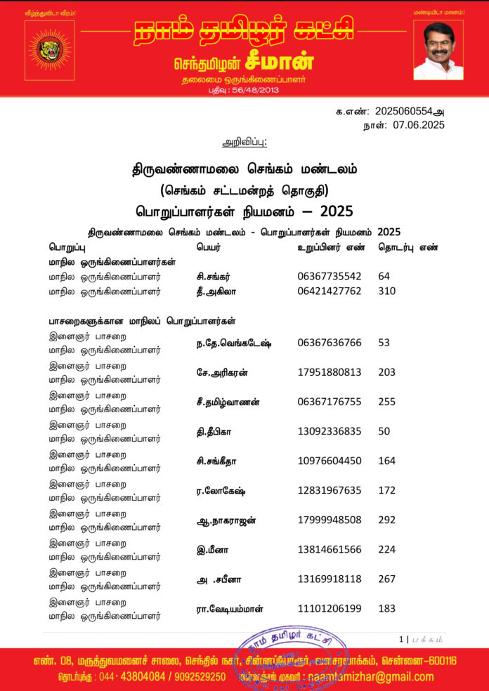 மேற்காண் அனைவரும் நாம் தமிழர் கட்சி – திருவண்ணாமலை செங்கம் மண்டலத்திற்குட்பட்ட பொறுப்பாளர்களாக நியமிக்கப்படுகிறார்கள். இவர்கள் அனைவருக்கும், கட்சியின் அனைத்துநிலைப் பொறுப்பாளர்களும், அன்பு உறவுகள் அனைவரும் முழு ஒத்துழைப்பு நல்குமாறு அன்போடு கேட்டுக் கொள்ளப்படுகிறார்கள்.