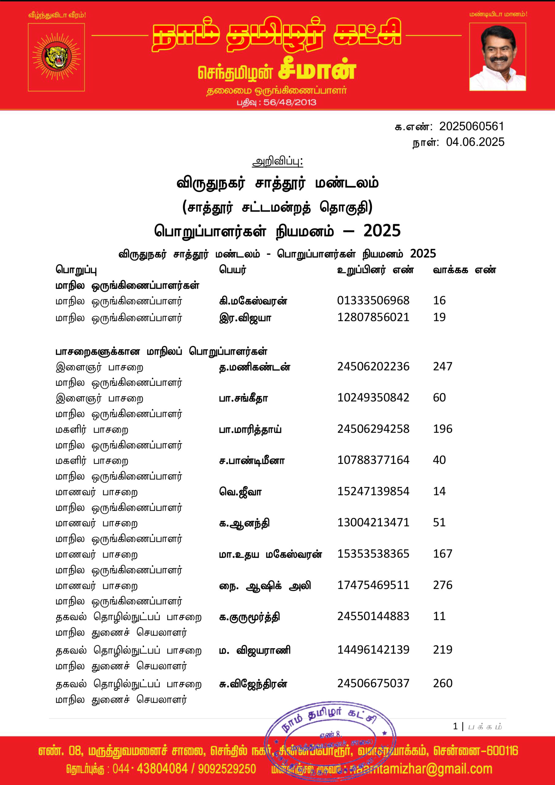 மேற்காண் அனைவரும் நாம் தமிழர் கட்சி – விருதுநகர் சாத்தூர் மண்டலத்திற்குட்பட்ட பொறுப்பாளர்களாக நியமிக்கப்படுகிறார்கள்.இவர்கள் அனைவருக்கும், கட்சியின் அனைத்துநிலைப் பொறுப்பாளர்களும், அன்பு உறவுகள் அனைவரும் முழு ஒத்துழைப்பு நல்குமாறு அன்போடு கேட்டுக் கொள்ளப்படுகிறார்கள்.
