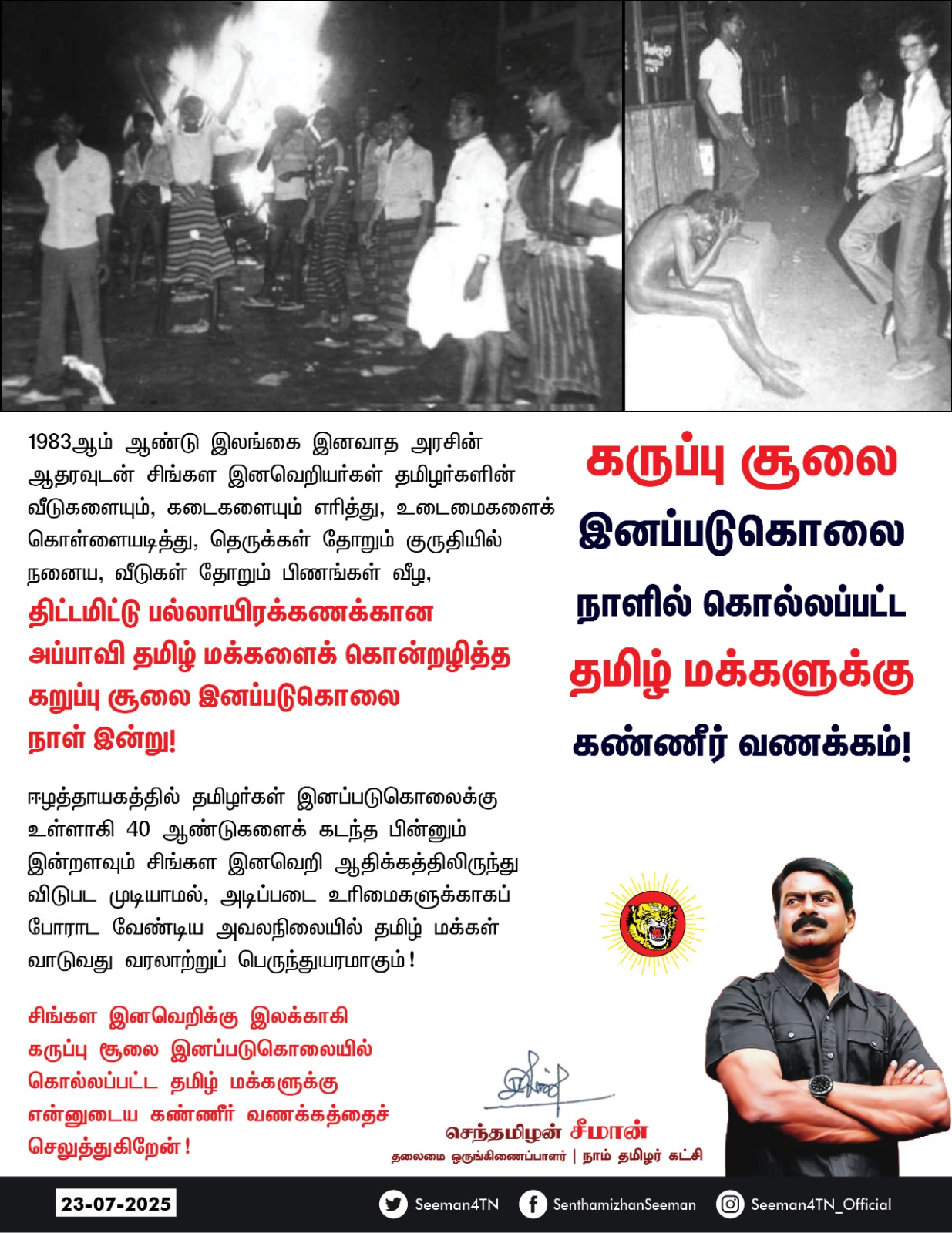 சிங்கள இனவெறிக்கு இலக்காகி கருப்பு சூலை இனப்படுகொலையில் கொல்லப்பட்ட தமிழ் மக்களுக்கு என்னுடைய கண்ணீர் வணக்கத்தைச் செலுத்துகிறேன்!