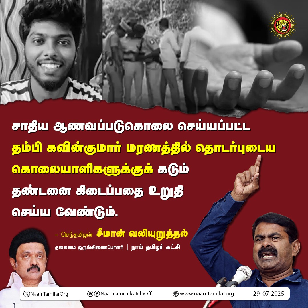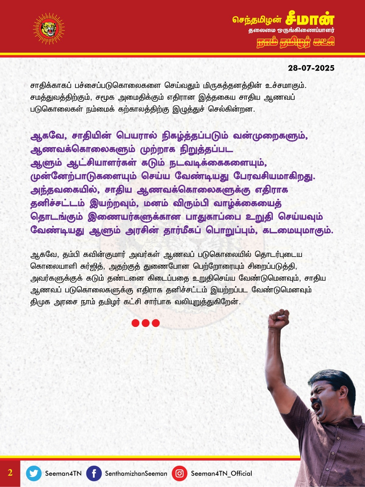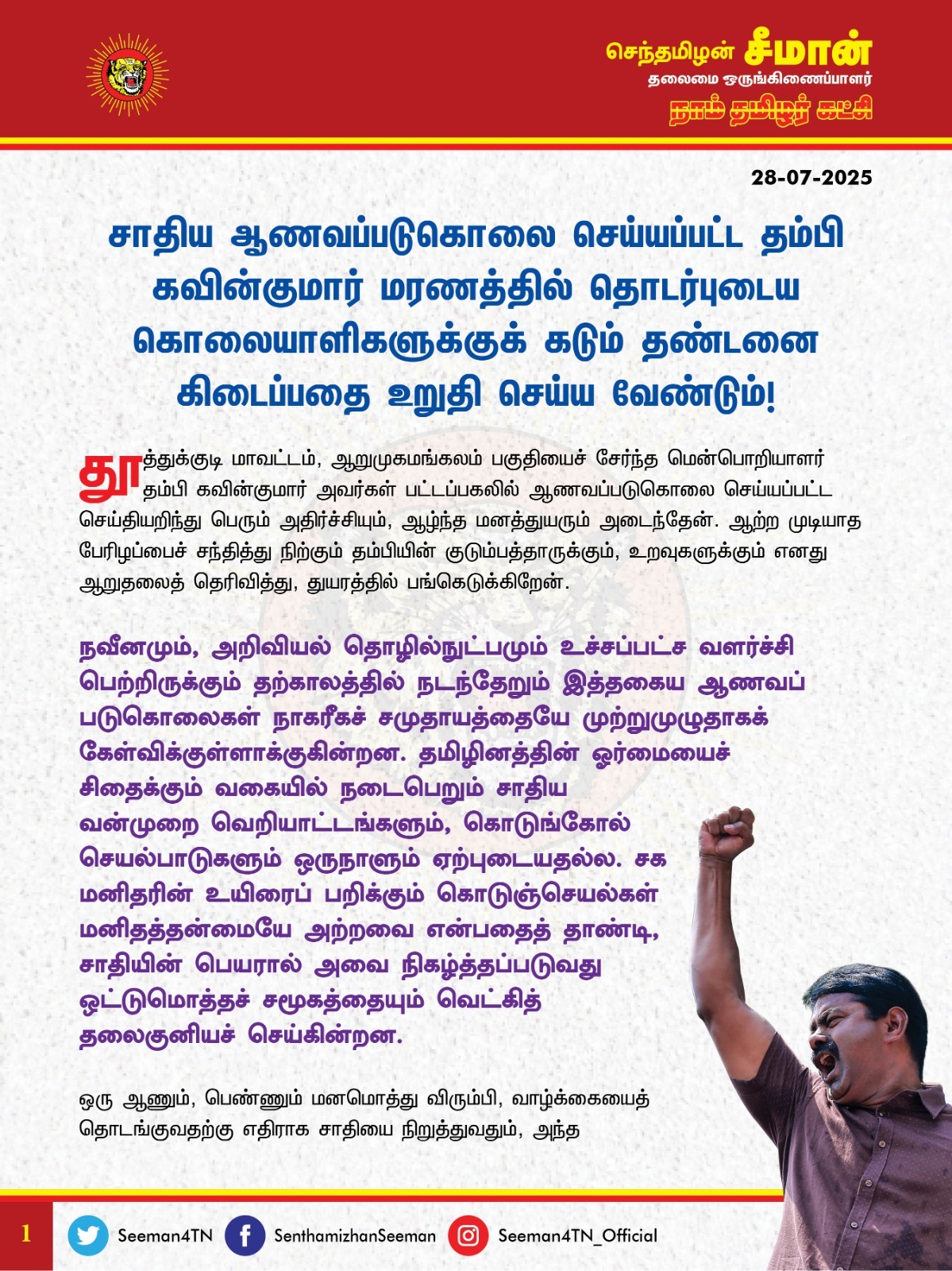ஆகவே, தம்பி கவின்குமார் அவர்கள் ஆணவப் படுகொலையில் தொடர்புடைய கொலையாளி சுர்ஜித், அதற்குத் துணைபோன பெற்றோரையும் சிறைப்படுத்தி, அவர்களுக்குக் கடும் தண்டனை கிடைப்பதை உறுதிசெய்ய வேண்டுமெனவும், சாதிய ஆணவப் படுகொலைகளுக்கு எதிராக தனிச்சட்டம் இயற்றப்பட வேண்டுமெனவும் திமுக அரசை நாம் தமிழர் கட்சி சார்பாக வலியுறுத்துகிறேன்.