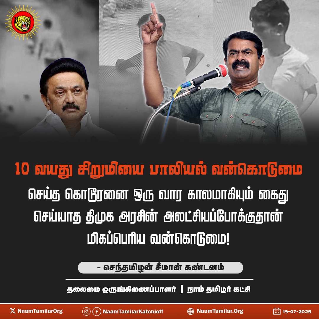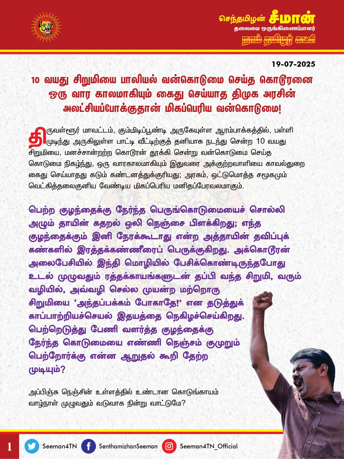 10 வயது சிறுமியை பாலியல் வன்கொடுமை செய்த கொடூரனை ஒரு வார காலமாகியும் கைது செய்யாத திமுக அரசின் அலட்சியப்போக்குதான் மிகப்பெரிய வன்கொடுமை! – சீமான் கடும் கண்டனம்