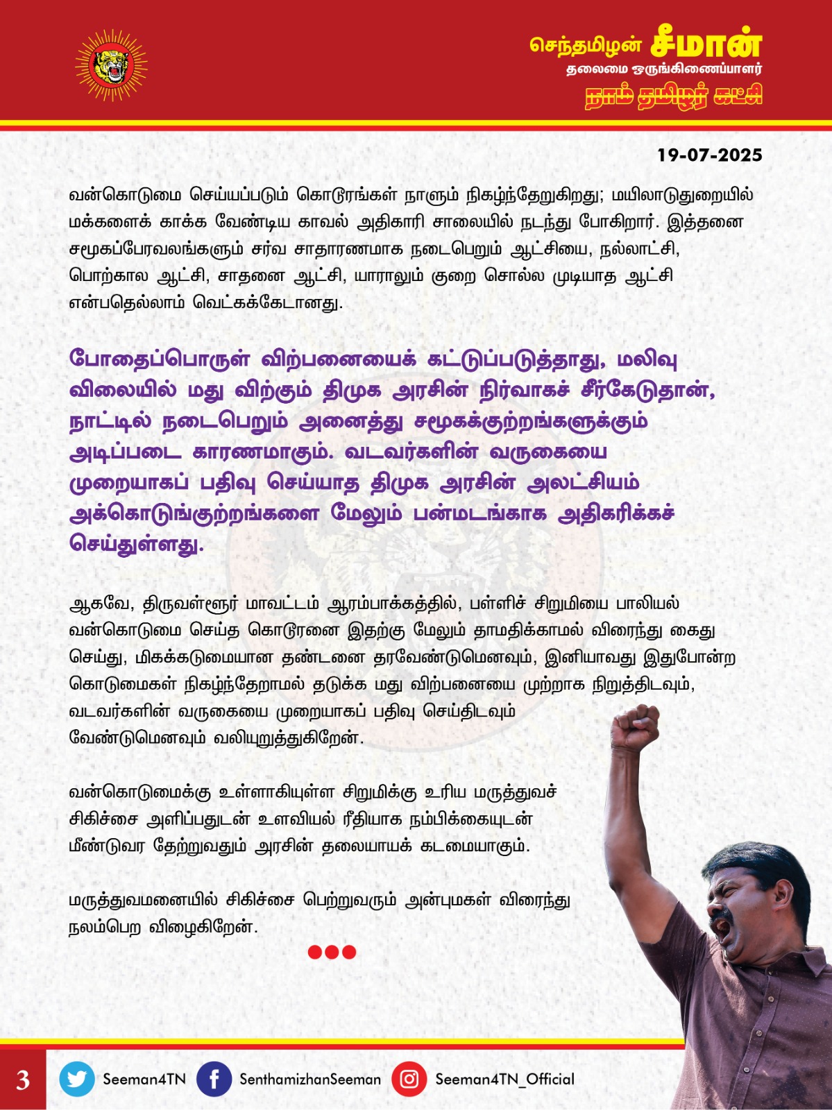 போதைப்பொருள் விற்பனையைக் கட்டுப்படுத்தாது, மலிவு விலையில் மது விற்கும் திமுக அரசின் நிர்வாகச் சீர்கேடுதான், நாட்டில் நடைபெறும் அனைத்து சமூகக்குற்றங்களுக்கும் அடிப்படை காரணமாகும். வடவர்களின் வருகையை முறையாகப் பதிவு செய்யாத திமுக அரசின் அலட்சியம் அக்கொடுங்குற்றங்களை மேலும் பன்மடங்காக அதிகரிக்கச் செய்துள்ளது.