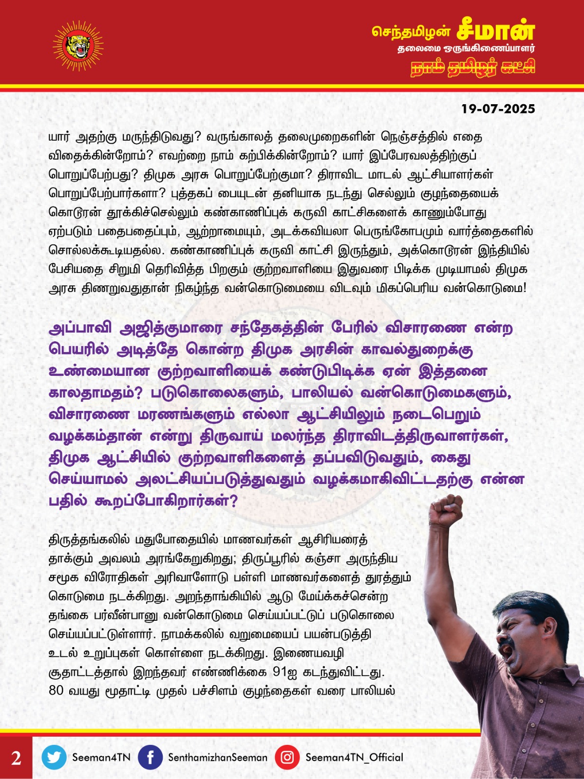 அப்பிஞ்சு நெஞ்சின் உள்ளத்தில் உண்டான கொடுங்காயம் வாழ்நாள் முழுவதும் வடுவாக நின்று வாட்டுமே? யார் அதற்கு மருந்திடுவது? வருங்காலத் தலைமுறைகளின் நெஞ்சத்தில் எதை விதைக்கின்றோம்? எவற்றை நாம் கற்பிக்கின்றோம்? யார் இப்பேரவலத்திற்குப் பொறுப்பேற்பது? திமுக அரசு பொறுப்பேற்குமா? திராவிட மாடல் ஆட்சியாளர்கள் பொறுப்பேற்பார்களா? புத்தகப் பையுடன் தனியாக நடந்து செல்லும் குழந்தையைக் கொடூரன் தூக்கிச்செல்லும் கண்காணிப்புக் கருவி காட்சிகளைக் காணும்போது ஏற்படும் பதைபதைப்பும், ஆற்றாமையும், அடக்கவியலா பெருங்கோபமும் வார்த்தைகளில் சொல்லக்கூடியதல்ல. கண்காணிப்புக் கருவி காட்சி இருந்தும், அக்கொடூரன் இந்தியில் பேசியதை சிறுமி தெரிவித்த பிறகும் குற்றவாளியை இதுவரை பிடிக்க முடியாமல் திமுக அரசு திணறுவதுதான் நிகழ்ந்த வன்கொடுமையை விடவும் மிகப்பெரிய வன்கொடுமை!