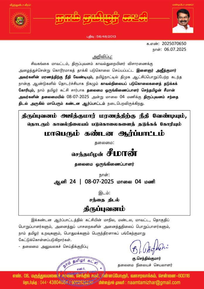 சிவகங்கை மாவட்டம், திருப்புவனம் காவல்துறையினர் விசாரணைக்கு அழைத்துச்சென்று கொடூரமாகத் தாக்கி படுகொலை செய்யப்பட்ட இளைஞர் அஜீத்குமார் அவர்களின் மரணத்திற்கு நீதி வேண்டியும், தமிழ்நாட்டில் திமுக ஆட்சிப்பொறுப்பேற்ற கடந்த நான்கு ஆண்டுகளில் தொடர்ச்சியாக நிகழும் காவல்நிலையப் படுகொலைகளைத் தடுக்கக் கோரியும், நாம் தமிழர் கட்சி சார்பாக தலைமை ஒருங்கிணைப்பாளர் செந்தமிழன் சீமான் அவர்களின் தலைமையில் 08-07-2025 அன்று மாலை 04 மணிக்கு திருப்புவனம் சந்தை திடல் அருகில் மாபெரும் கண்டன ஆர்ப்பாட்டம் நடைபெறவிருக்கிறது.