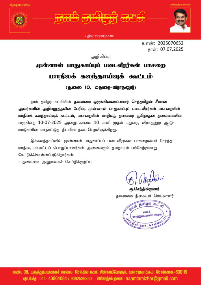 நாம் தமிழர் கட்சியின் தலைமை ஒருங்கிணைப்பாளர் செந்தமிழன் சீமான் அவர்களின் அறிவுறுத்தலின் பேரில், முன்னாள் பாதுகாப்புப் படைவீரர்கள் பாசறையின் மாநிலக் கலந்தாய்வுக் கூட்டம், பாசறையின் மாநிலத் தலைவர் பூமிநாதன் தலைமையில் வருகின்ற 10-07-2025 அன்று காலை 10 மணி முதல் மதுரை, விராதனூர் ஆடு-மாடுகளின் மாநாட்டுத் திடலில் நடைபெறவிருக்கிறது.